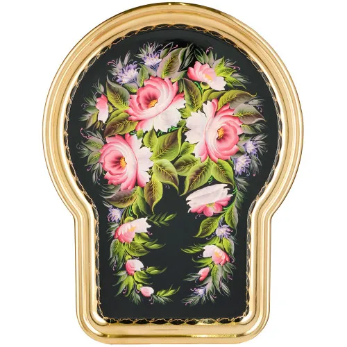 Поднос для самовара формы «Замочная скважина малая» с худ. росписью «Пионы на чёрном в золоте»