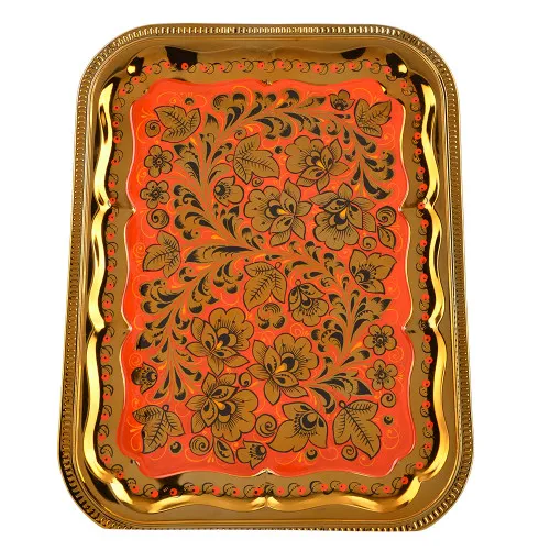 Поднос для самовара прямоугольный с художественной росписью «Кудрина золото на красном»