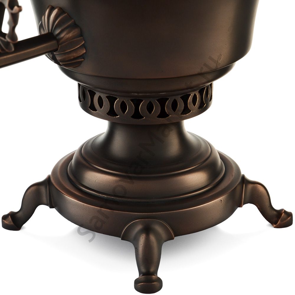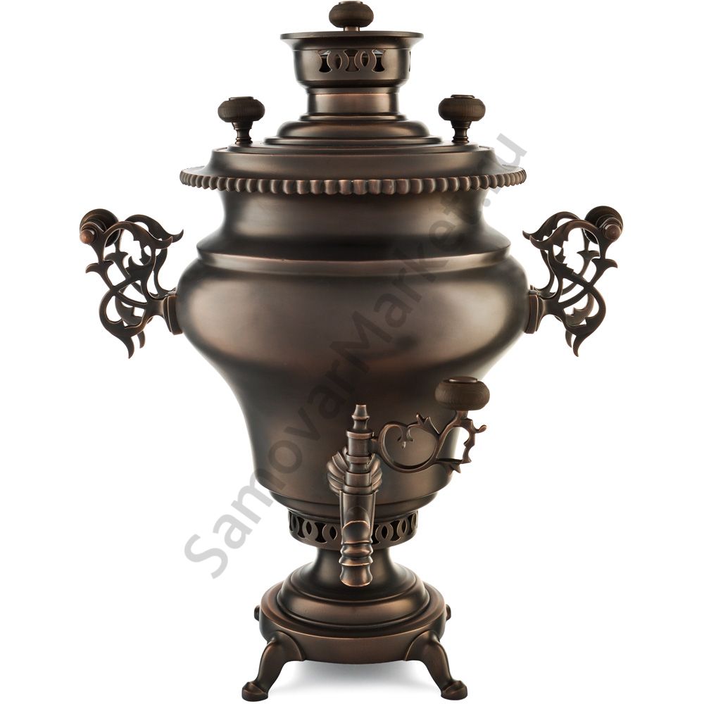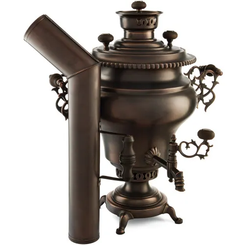 Этот самовар работает на дровах, углях, шишках, щепе. Топится он при помощи трубы, которая устанавливается сверху для образования тяги, или при помощи сапога в качестве мехов. Внутренние стенки покрыты пищевым оловом методом гальваники.