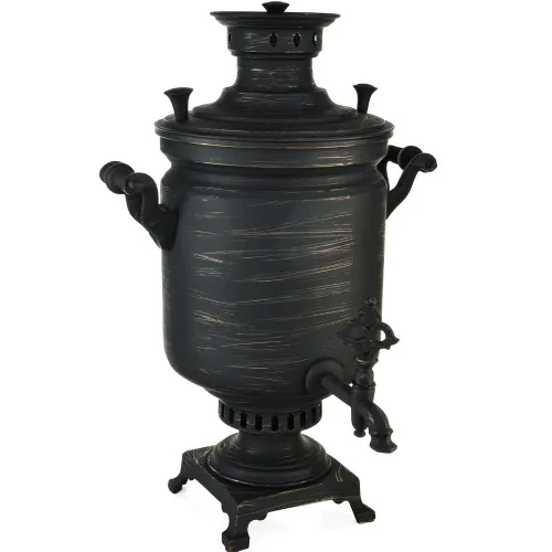 Этот самовар работает на дровах, углях, шишках, щепе. Топится он при помощи трубы, которая устанавливается сверху для образования тяги. Или при помощи сапога в качестве мехов. Внутренние стенки покрыты пищевым оловом методом гальваники.