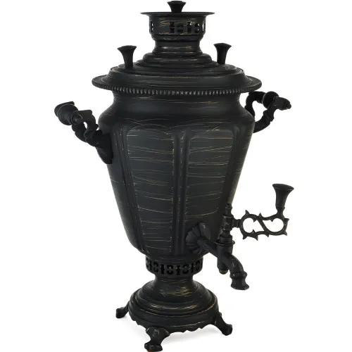 Этот самовар работает на дровах, углях, шишках, щепе. Топится он при помощи трубы, которая устанавливается сверху для образования тяги. Или при помощи сапога в качестве мехов. Внутренние стенки покрыты пищевым оловом методом гальваники.