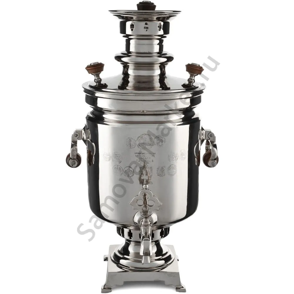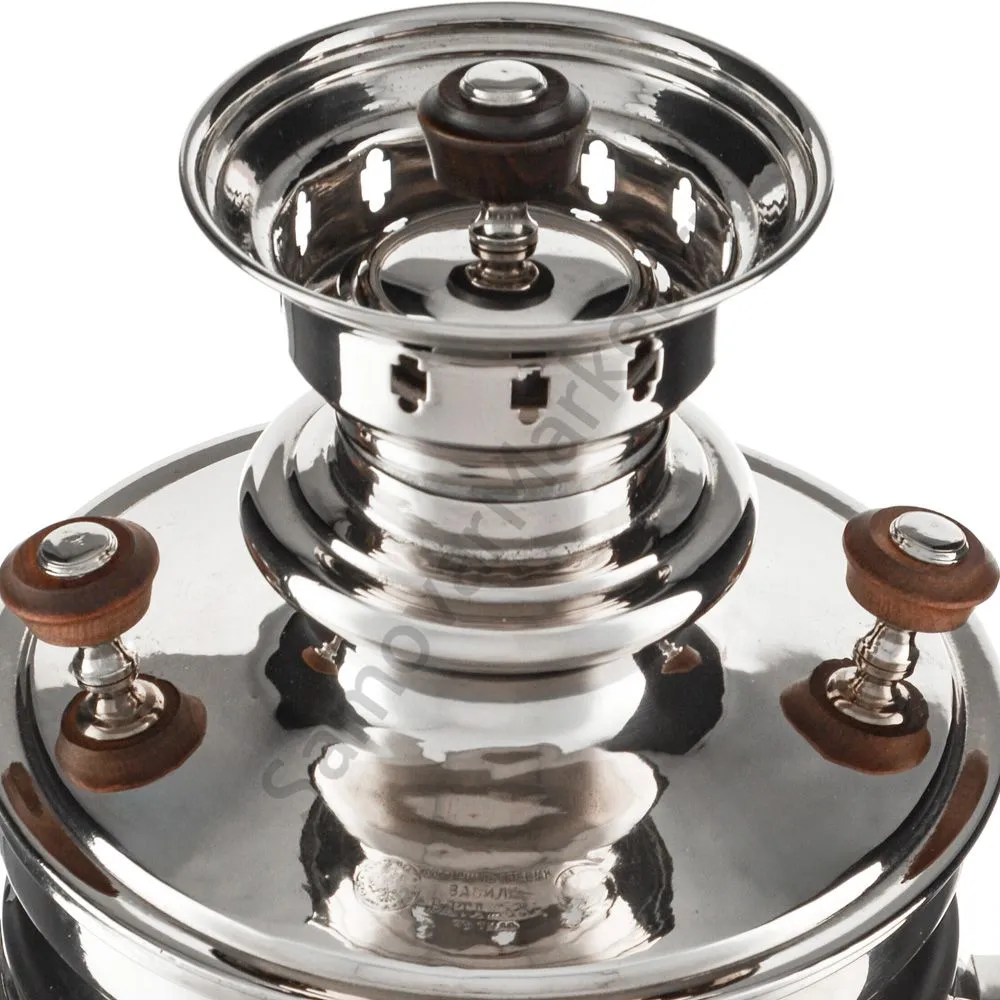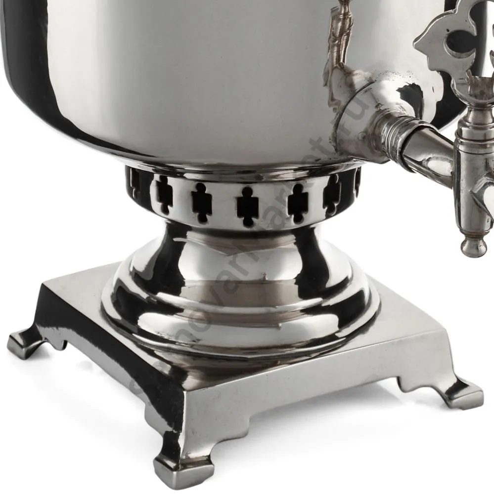 Этот самовар работает на дровах, углях, шишках, щепе. Топится он при помощи трубы, которая устанавливается сверху для образования тяги. Или при помощи сапога в качестве мехов. Внутренние стенки покрыты пищевым оловом методом гальваники.