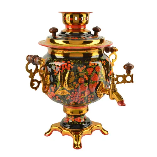 Ручки и хватки изготовлены из натурального дерева – берёзы, устойчивой к перепаду температур. Фурнитура роскошного глубокого каштанового цвета элитного красного дерева. Полностью готов к применению. Художественная роспись выполнена вручную специальными жаропрочными красками. Каждое изделие немного уникально и придает чаепитию особую красочность и даже праздничность. Сделано в Туле.
