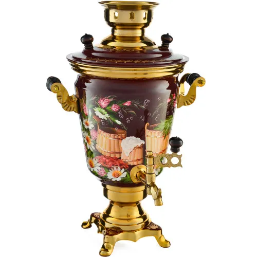 Ручки и хватки изготовлены из натурального дерева – берёзы, устойчивой к перепаду температур. Фурнитура роскошного глубокого каштанового цвета элитного красного дерева. Полностью готов к применению. Художественная роспись выполнена вручную специальными жаропрочными красками. Каждое изделие немного уникально и придает чаепитию особую красочность и даже праздничность. Сделано в Туле.