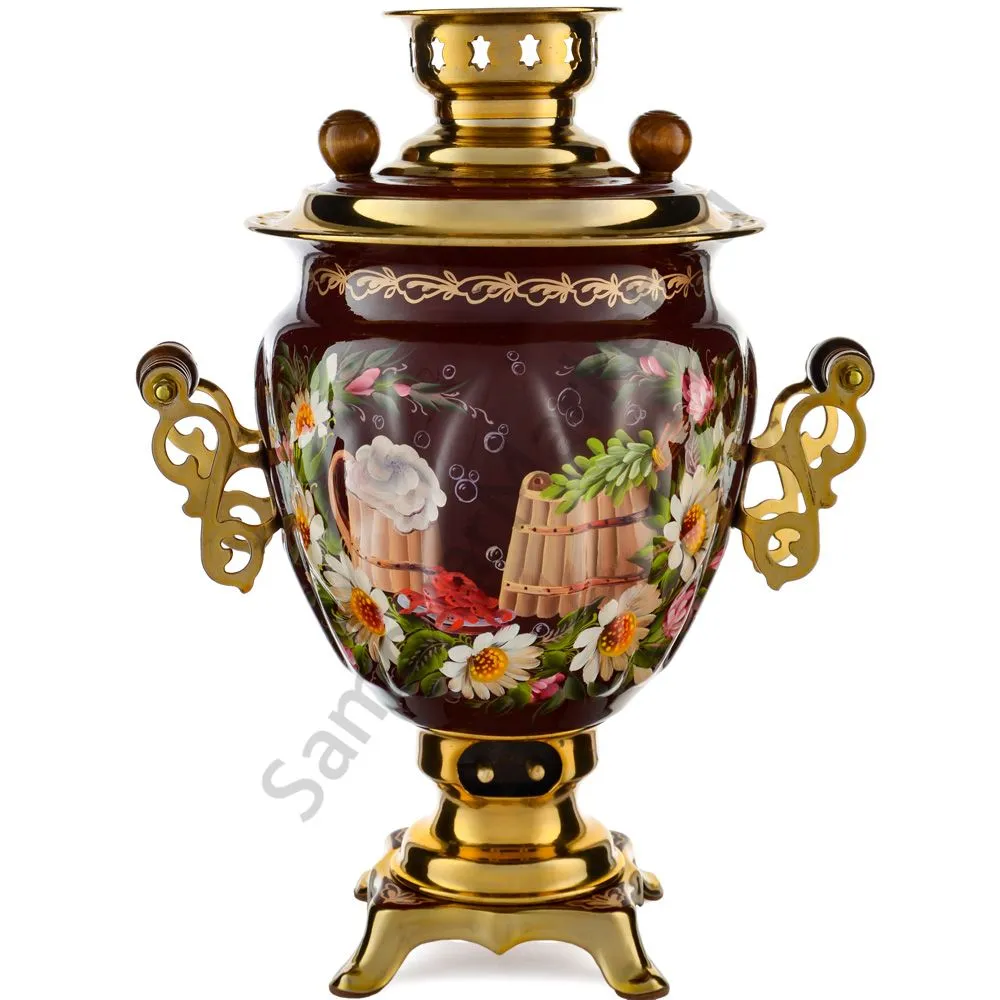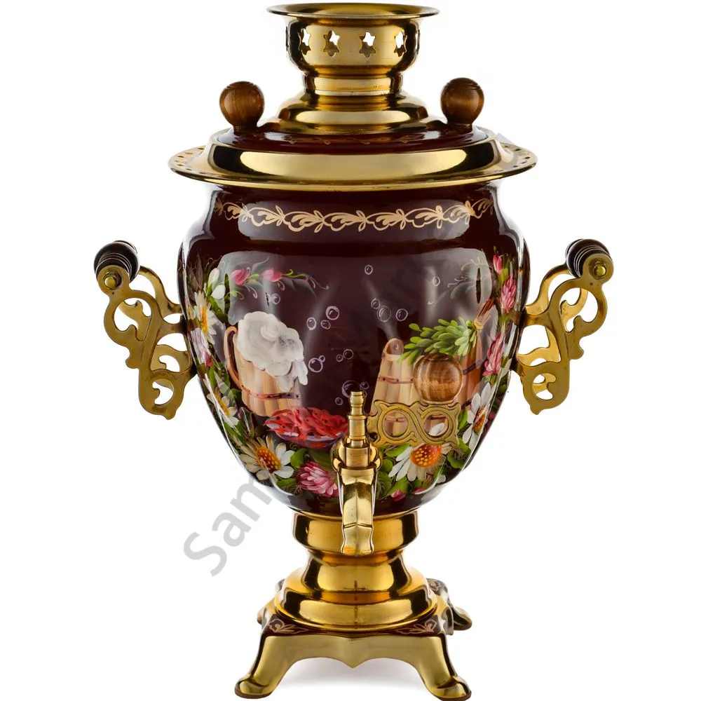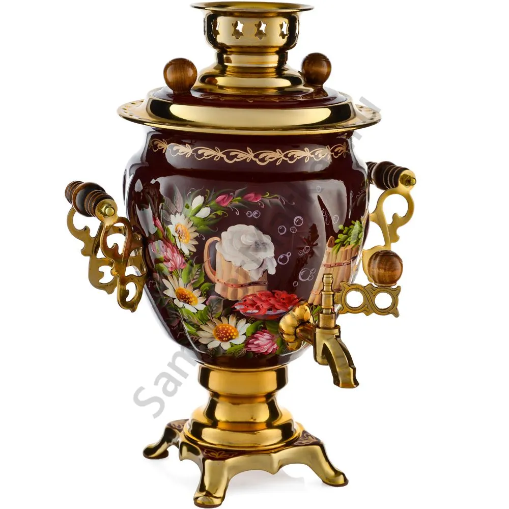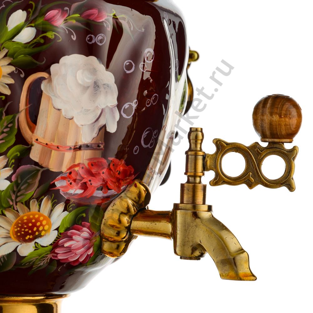 Ручки и хватки изготовлены из натурального дерева – берёзы, устойчивой к перепаду температур. Фурнитура роскошного глубокого каштанового цвета элитного красного дерева. Полностью готов к применению. Художественная роспись выполнена вручную специальными жаропрочными красками. Каждое изделие немного уникально и придает чаепитию особую красочность и даже праздничность. Сделано в Туле.