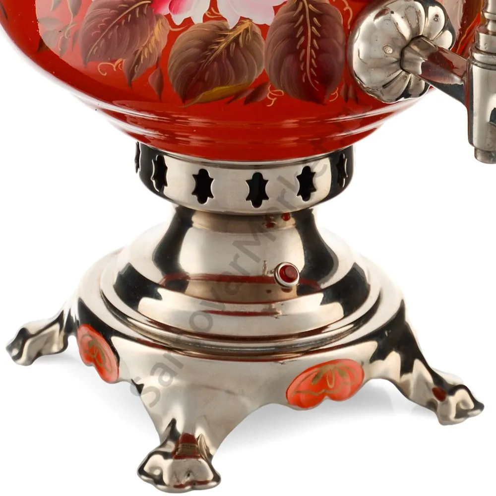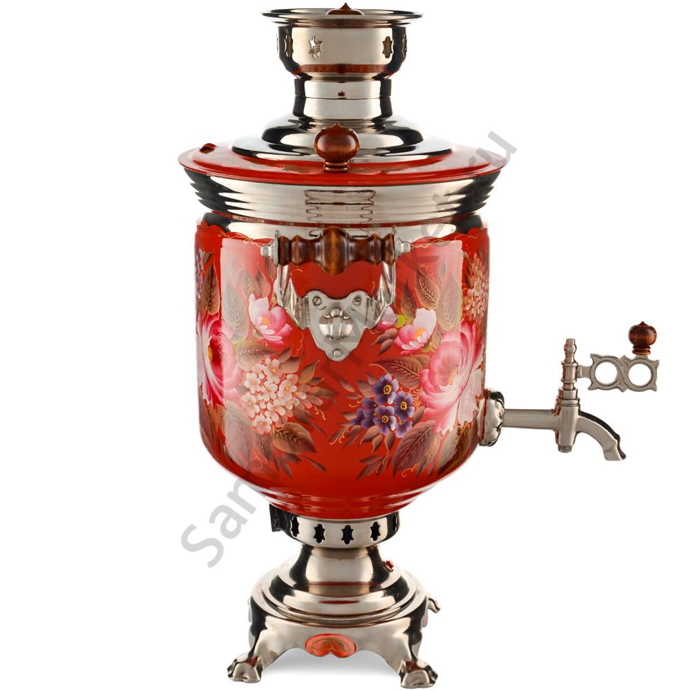 Работает от сети 220 V. К самовару прилагается шнур, красочная упаковка и инструкция по эксплуатации.