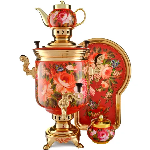 Ручки и хватки изготовлены из натурального дерева – берёзы, устойчивой к перепаду температур. Фурнитура роскошного глубокого каштанового цвета элитного красного дерева. Полностью готов к применению. Художественная роспись выполнена вручную специальными жаропрочными красками. Каждое изделие немного уникально и придает чаепитию особую красочность и даже праздничность. Сделано в Туле.