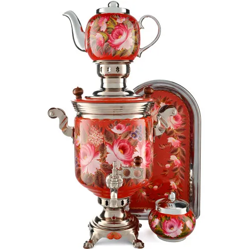 Ручки и хватки изготовлены из натурального дерева – берёзы, устойчивой к перепаду температур. Фурнитура роскошного глубокого каштанового цвета элитного красного дерева. Полностью готов к применению. Художественная роспись выполнена вручную специальными жаропрочными красками. Каждое изделие немного уникально и придает чаепитию особую красочность и даже праздничность. Сделано в Туле.
