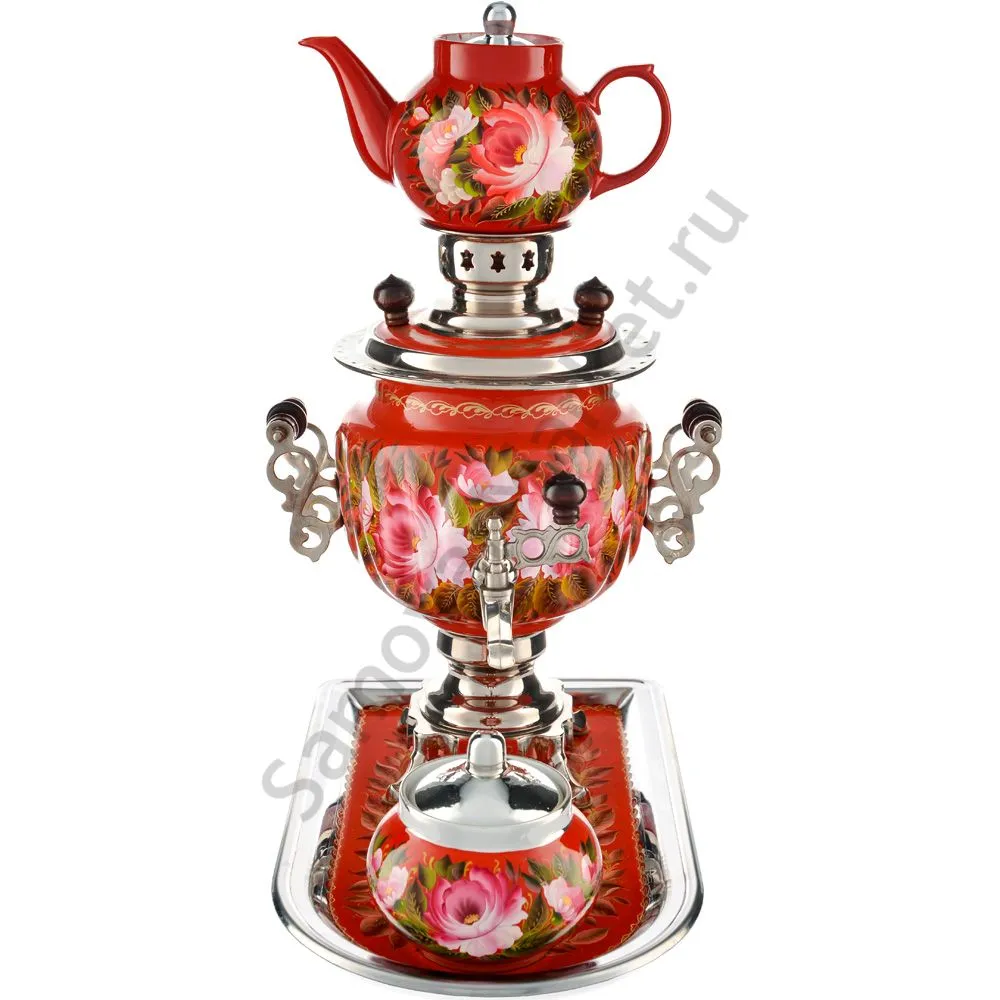 Ручки и хватки изготовлены из натурального дерева – берёзы, устойчивой к перепаду температур. Фурнитура роскошного глубокого каштанового цвета элитного красного дерева. Полностью готов к применению. Художественная роспись выполнена вручную специальными жаропрочными красками. Каждое изделие немного уникально и придает чаепитию особую красочность и даже праздничность. Сделано в Туле.