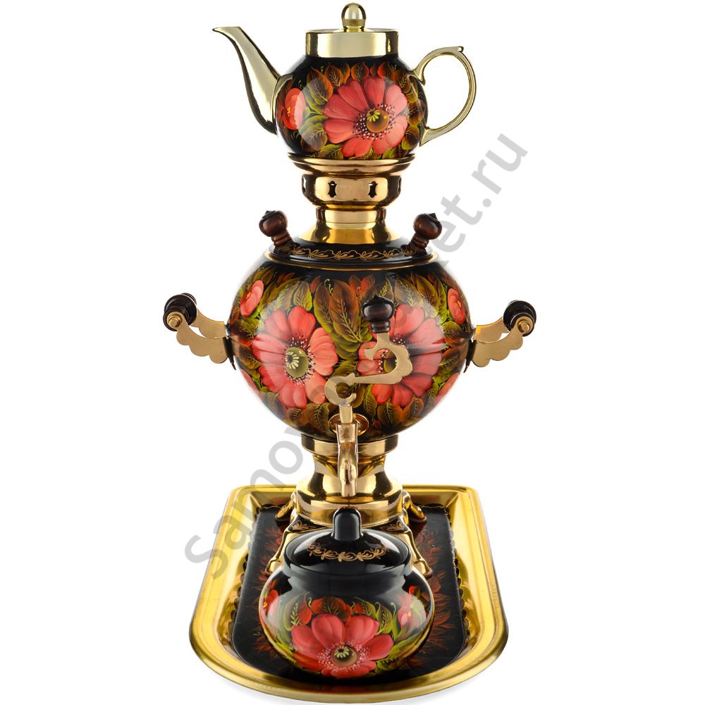 Самовар электрический 3 литра с художественной росписью «Маки на чёрном» формы «Шар» в наборе