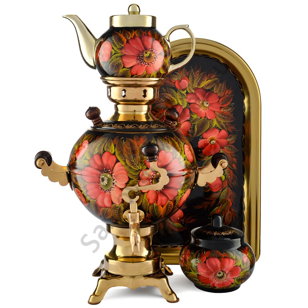 Ручки и хватки изготовлены из натурального дерева – берёзы, устойчивой к перепаду температур. Фурнитура роскошного глубокого каштанового цвета элитного красного дерева. Полностью готов к применению. Художественная роспись выполнена вручную специальными жаропрочными красками. Каждое изделие немного уникально и придает чаепитию особую красочность и даже праздничность. Сделано в Туле.