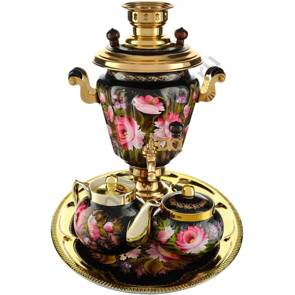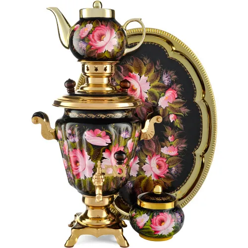 Ручки и хватки изготовлены из натурального дерева – берёзы, устойчивой к перепаду температур. Фурнитура роскошного глубокого каштанового цвета элитного красного дерева. Полностью готов к применению. Художественная роспись выполнена вручную специальными жаропрочными красками. Каждое изделие немного уникально и придает чаепитию особую красочность и даже праздничность. Сделано в Туле.