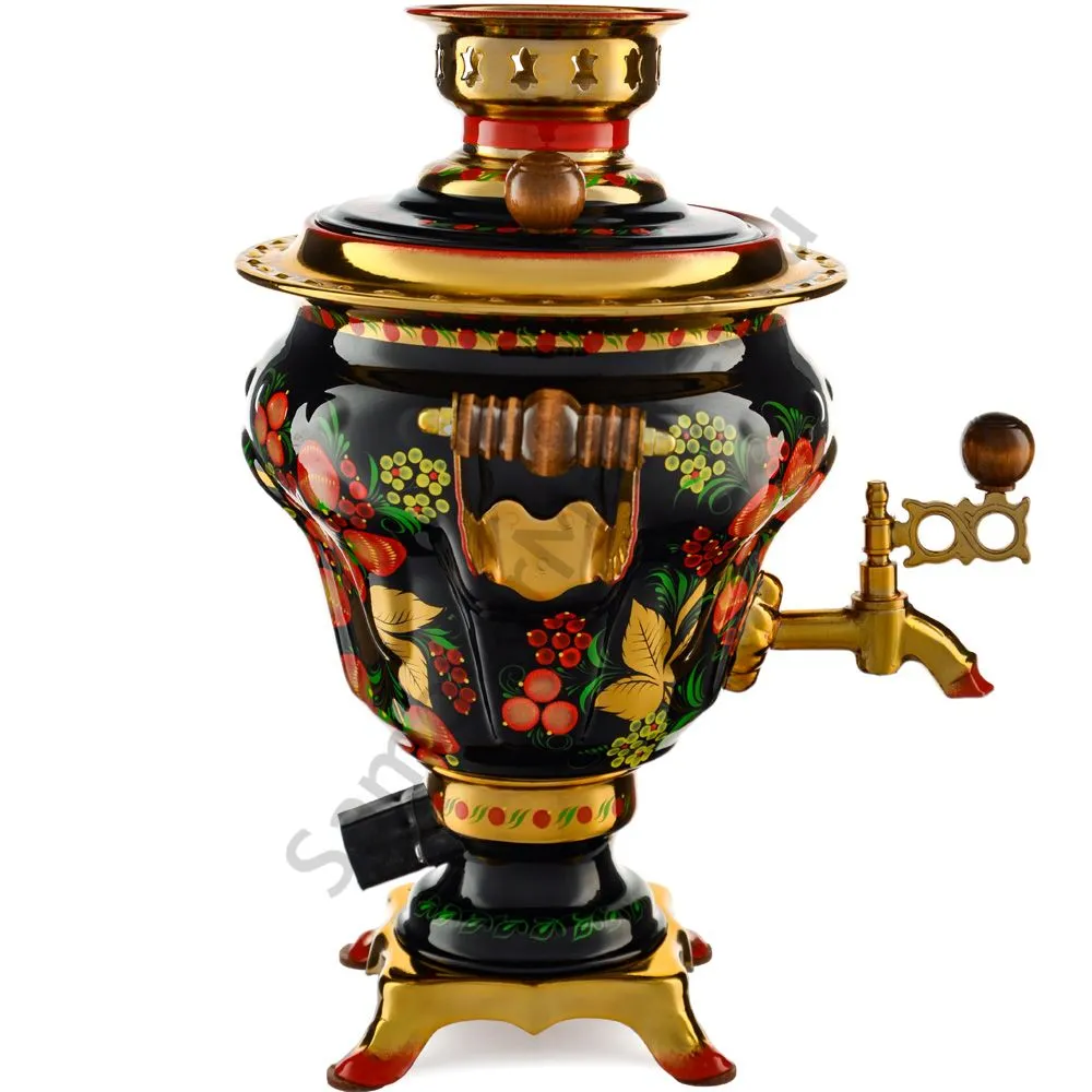 Работает от сети 220 V. К самовару прилагается шнур, красочная упаковка и инструкция по эксплуатации.