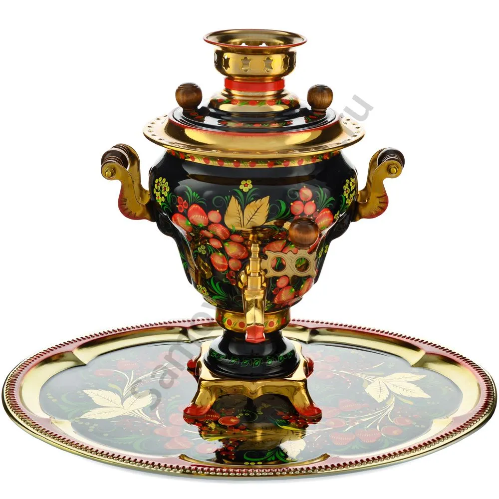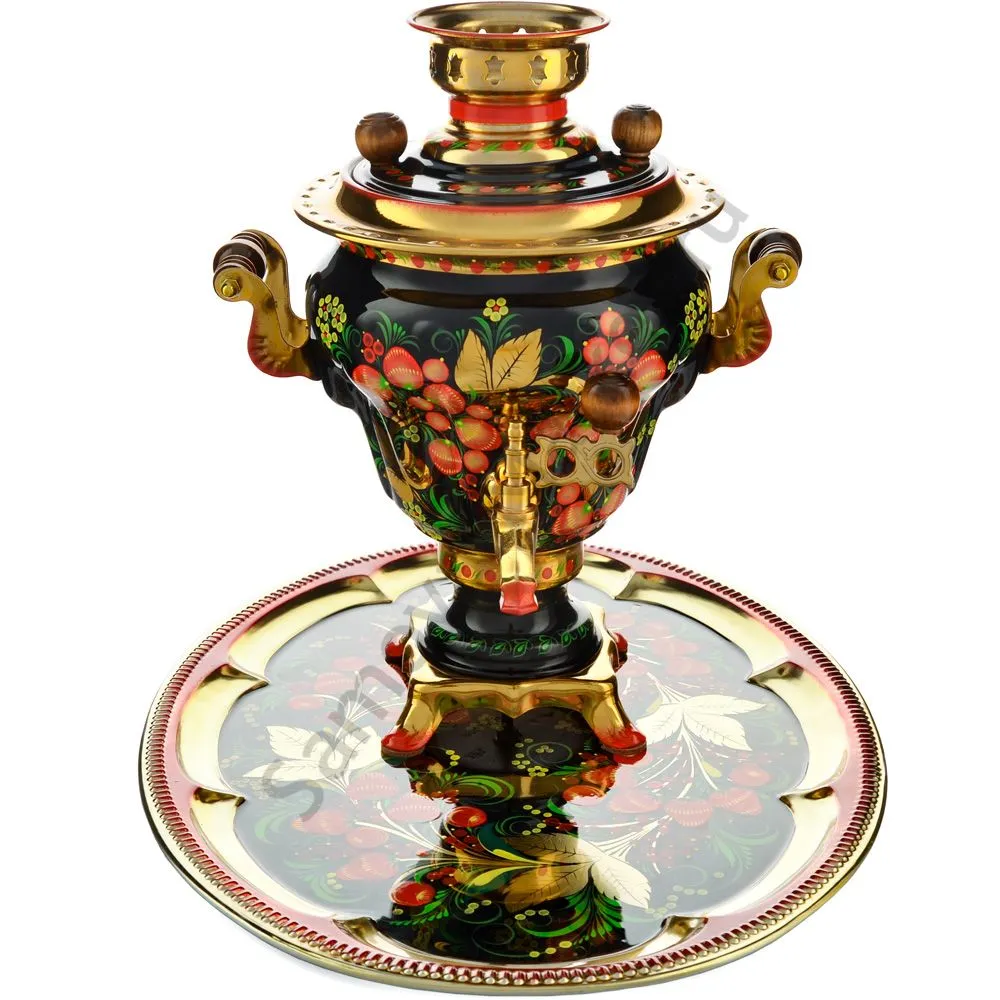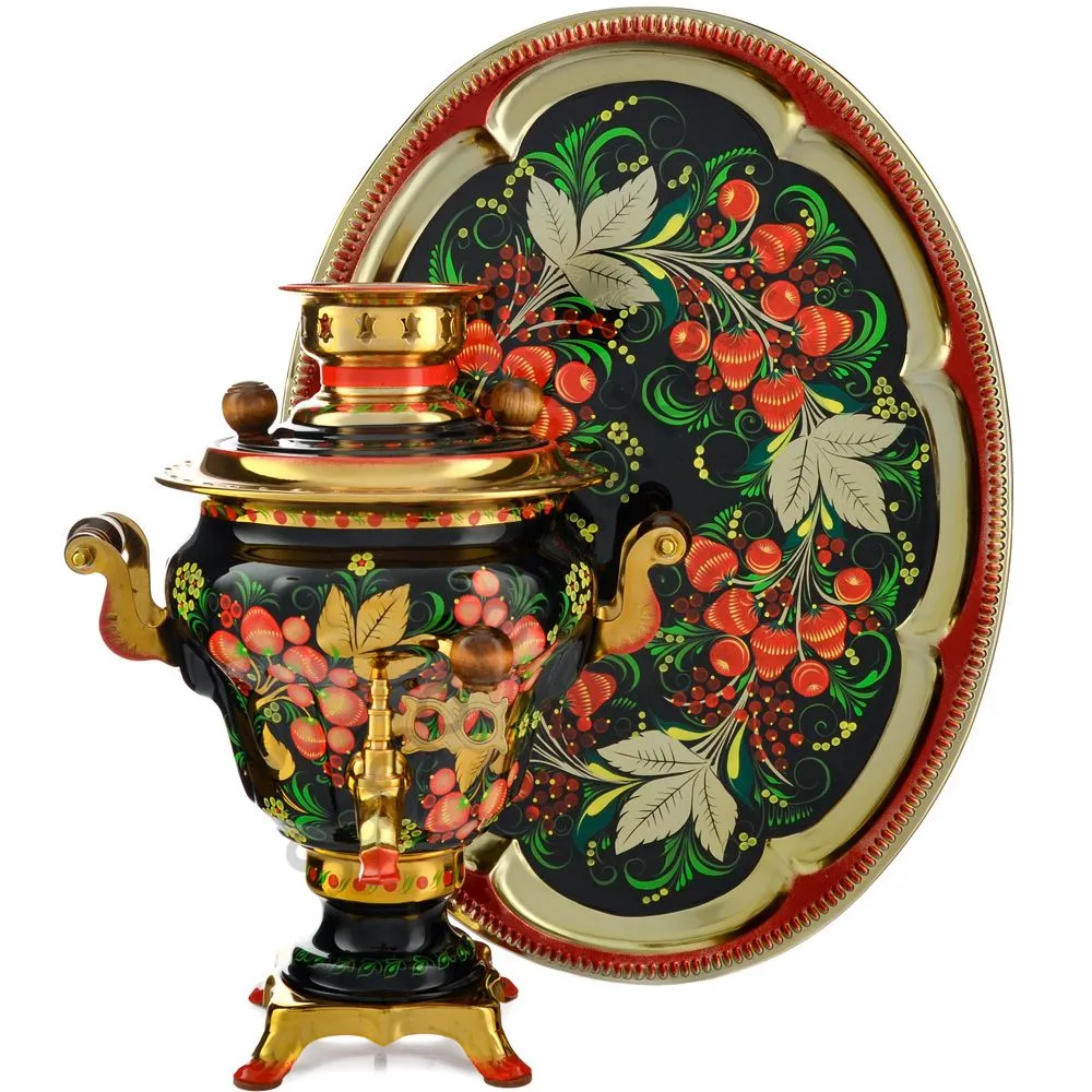 Ручки и хватки изготовлены из натурального дерева – берёзы, устойчивой к перепаду температур. Фурнитура роскошного глубокого каштанового цвета элитного красного дерева. Полностью готов к применению. Художественная роспись выполнена вручную специальными жаропрочными красками. Каждое изделие немного уникально и придает чаепитию особую красочность и даже праздничность. Сделано в Туле.