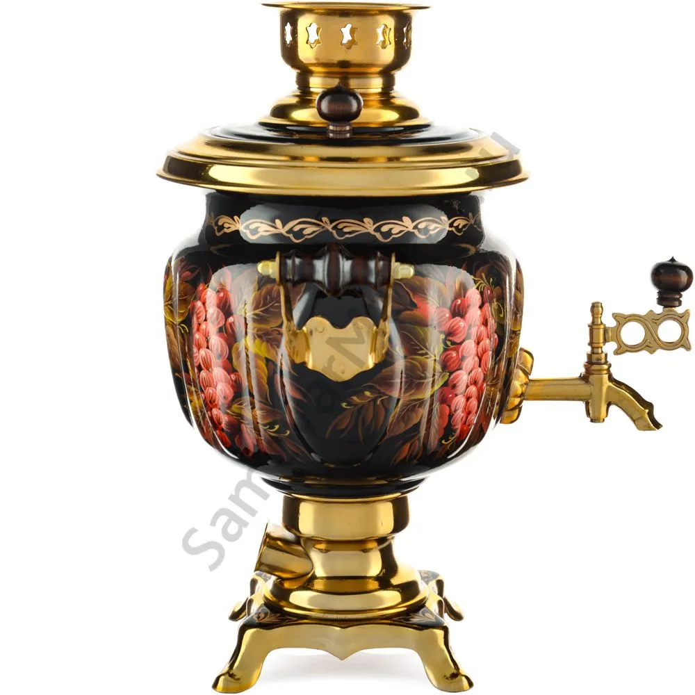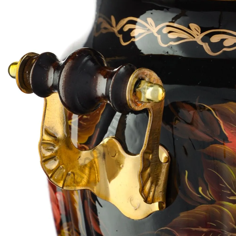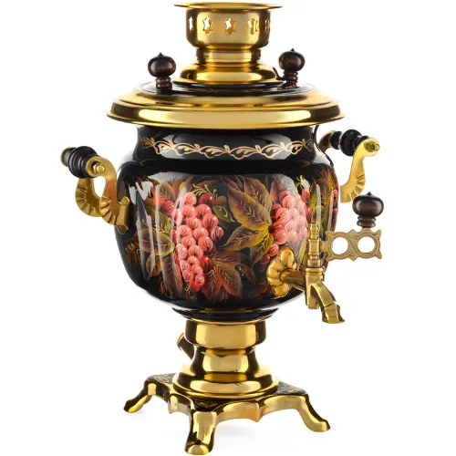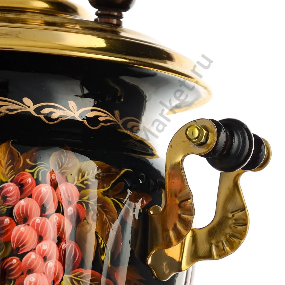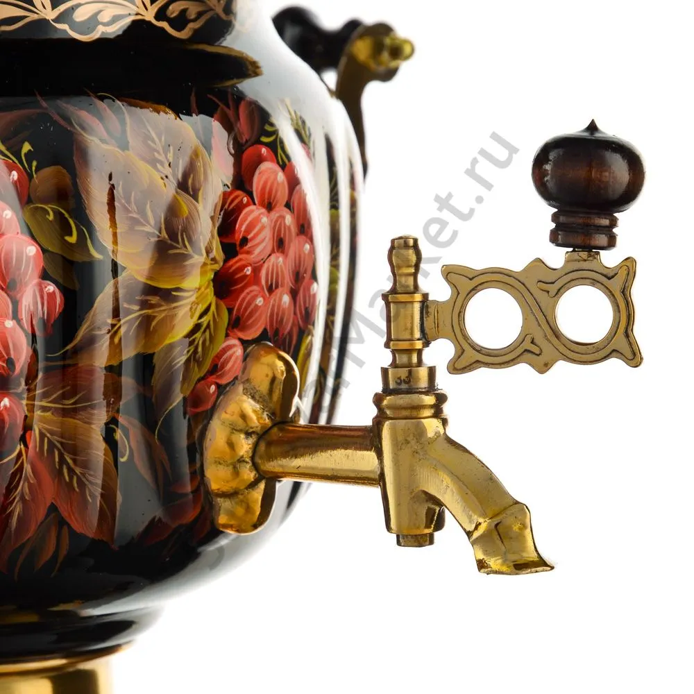 Ручки и хватки изготовлены из натурального дерева – берёзы, устойчивой к перепаду температур. Фурнитура роскошного глубокого каштанового цвета элитного красного дерева. Полностью готов к применению. Художественная роспись выполнена вручную специальными жаропрочными красками. Каждое изделие немного уникально и придает чаепитию особую красочность и даже праздничность. Сделано в Туле.