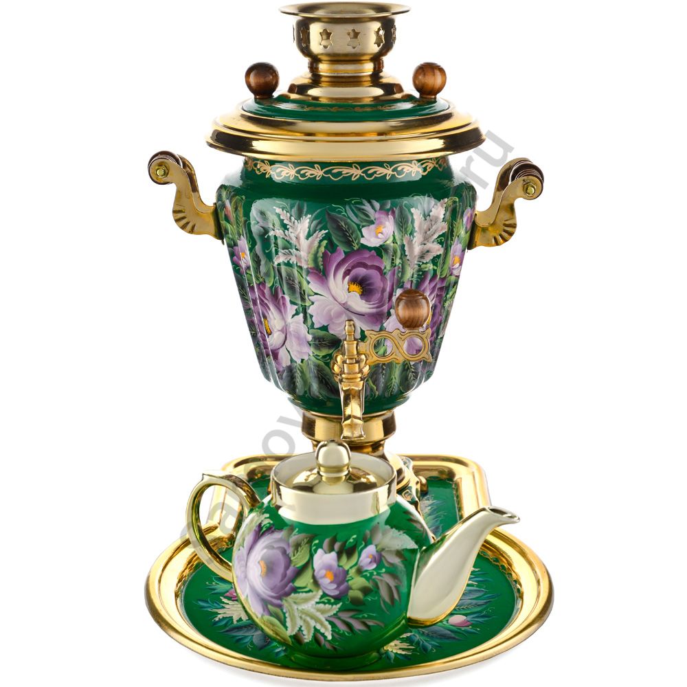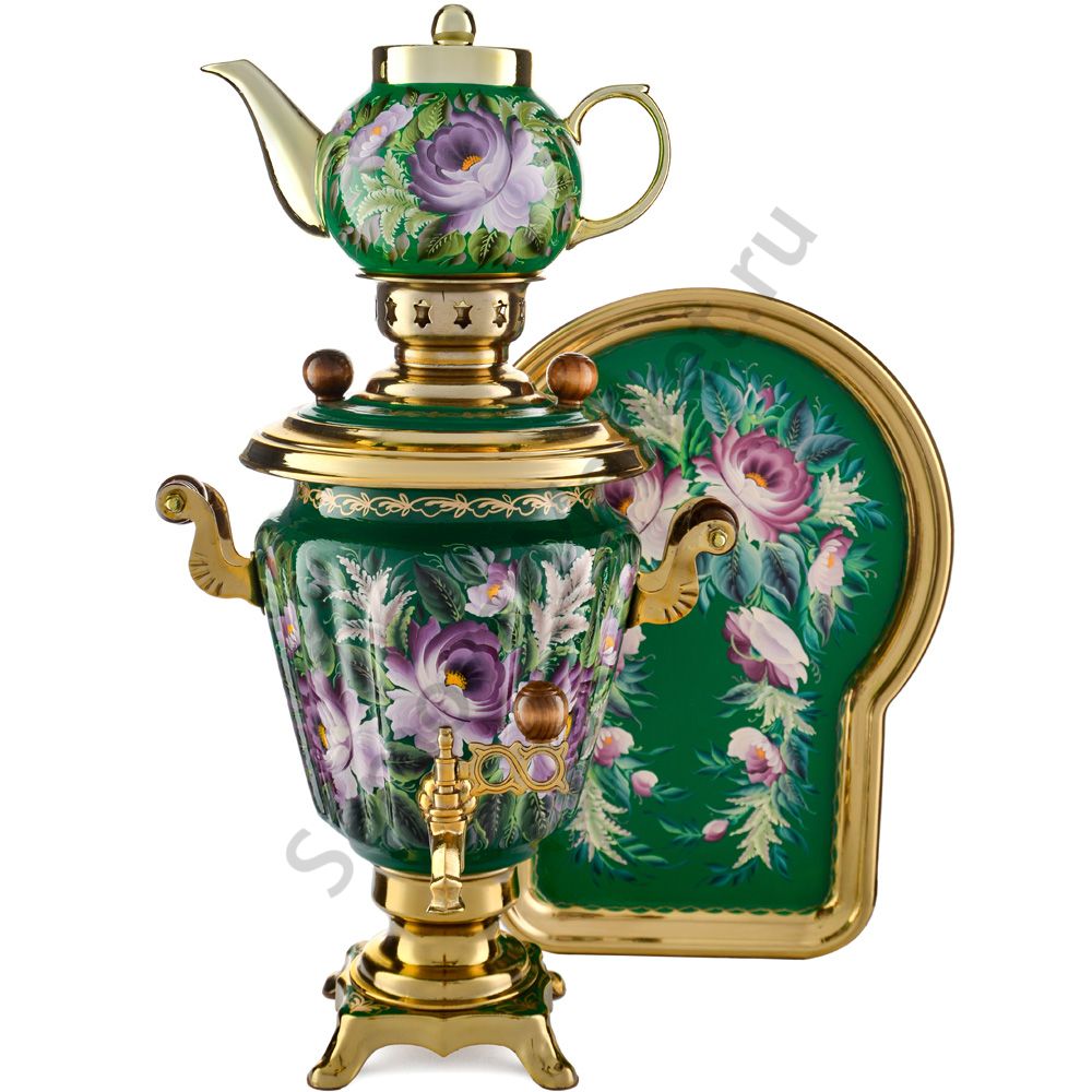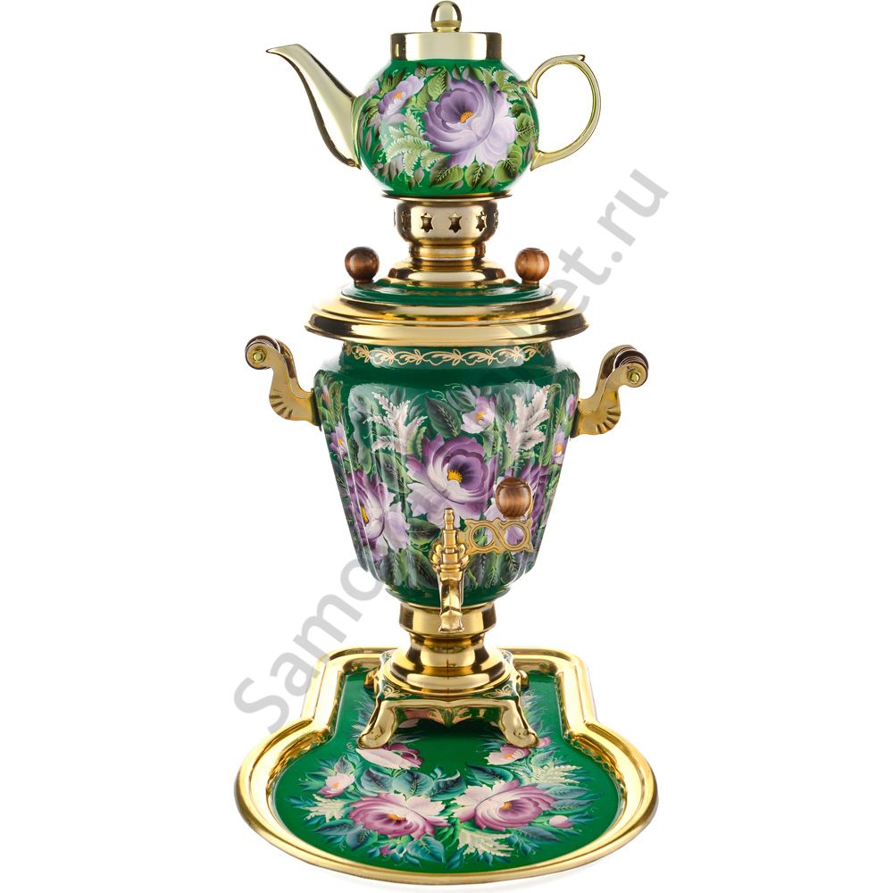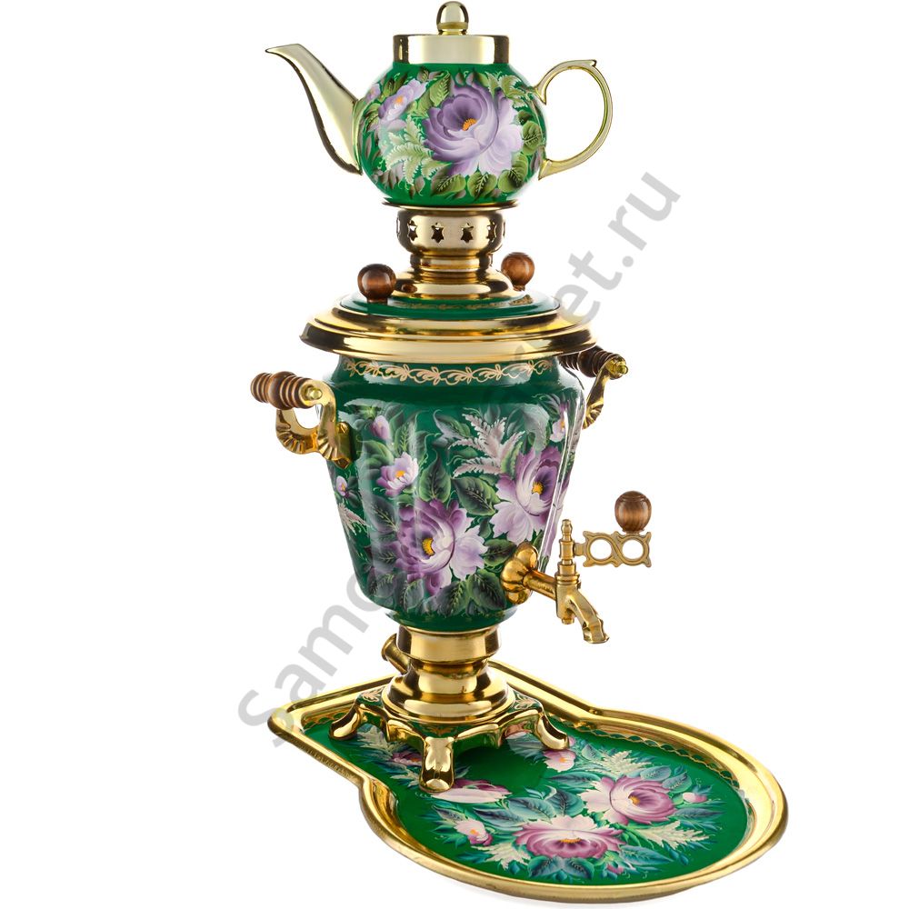 Ручки и хватки изготовлены из натурального дерева – берёзы, устойчивой к перепаду температур. Фурнитура роскошного глубокого каштанового цвета элитного красного дерева. Полностью готов к применению. Художественная роспись выполнена вручную специальными жаропрочными красками. Каждое изделие немного уникально и придает чаепитию особую красочность и даже праздничность. Сделано в Туле.