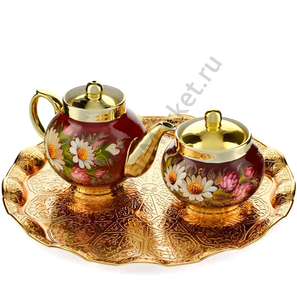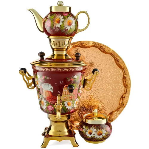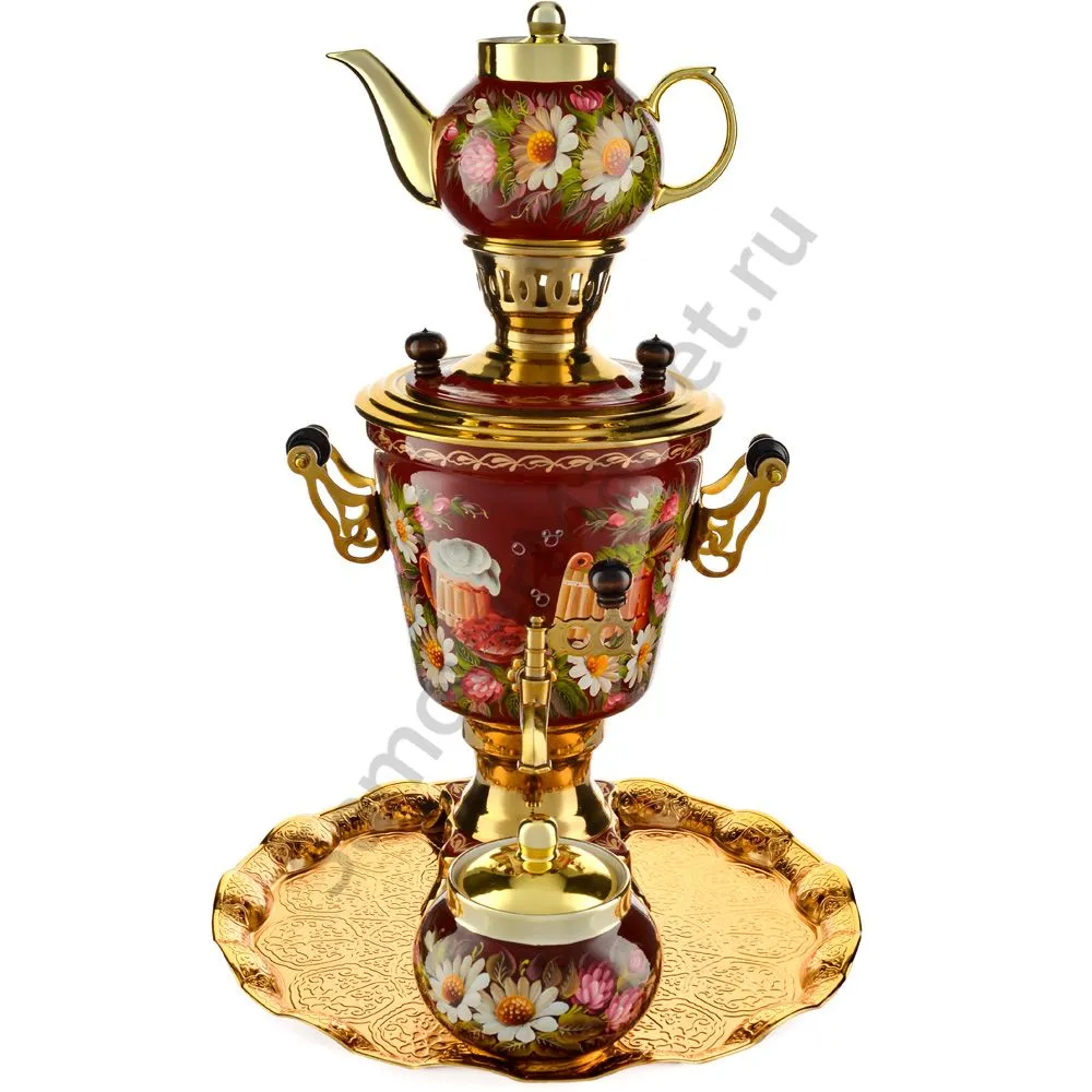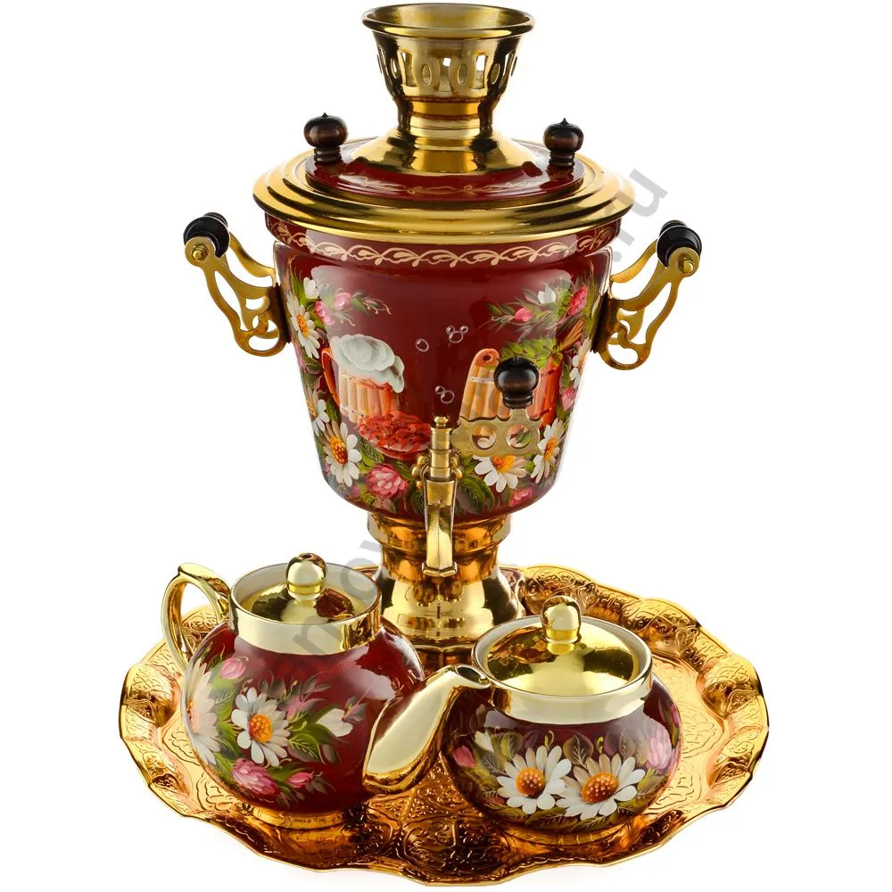 Ручки и хватки изготовлены из натурального дерева – берёзы, устойчивой к перепаду температур. Фурнитура роскошного глубокого каштанового цвета элитного красного дерева. Полностью готов к применению. Художественная роспись выполнена вручную специальными жаропрочными красками. Каждое изделие немного уникально и придает чаепитию особую красочность и даже праздничность. Сделано в Туле.