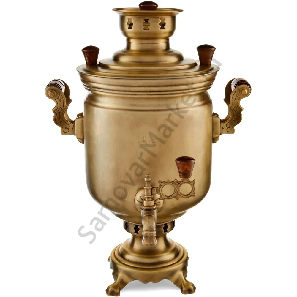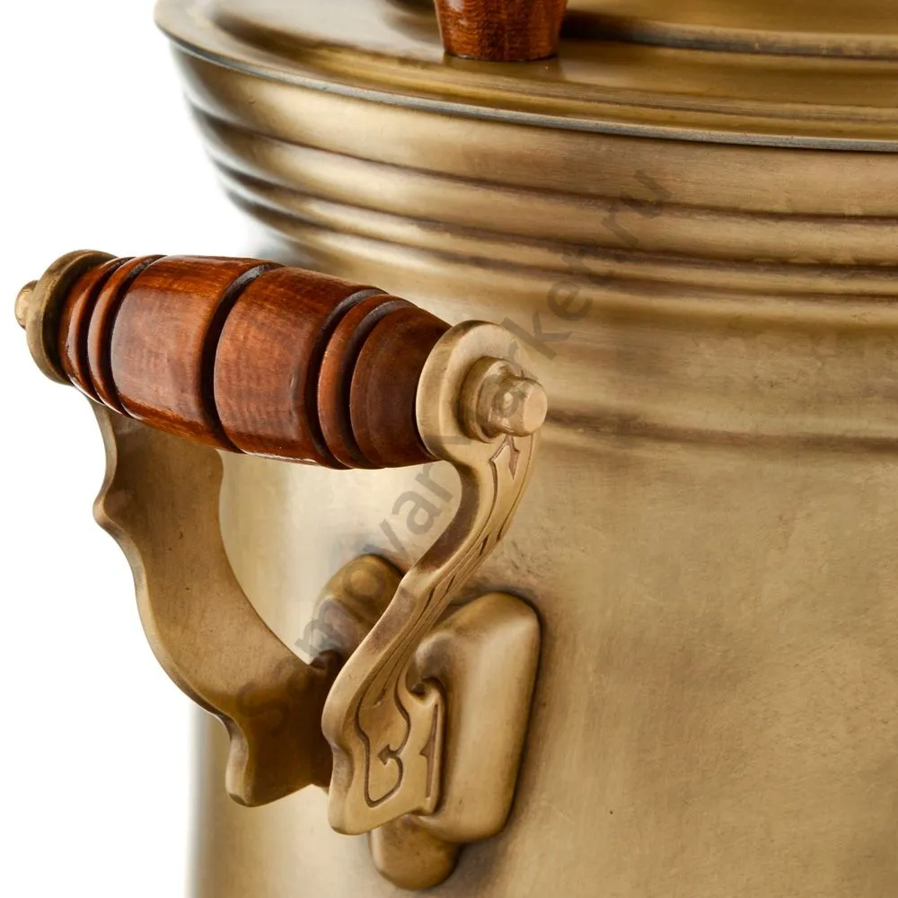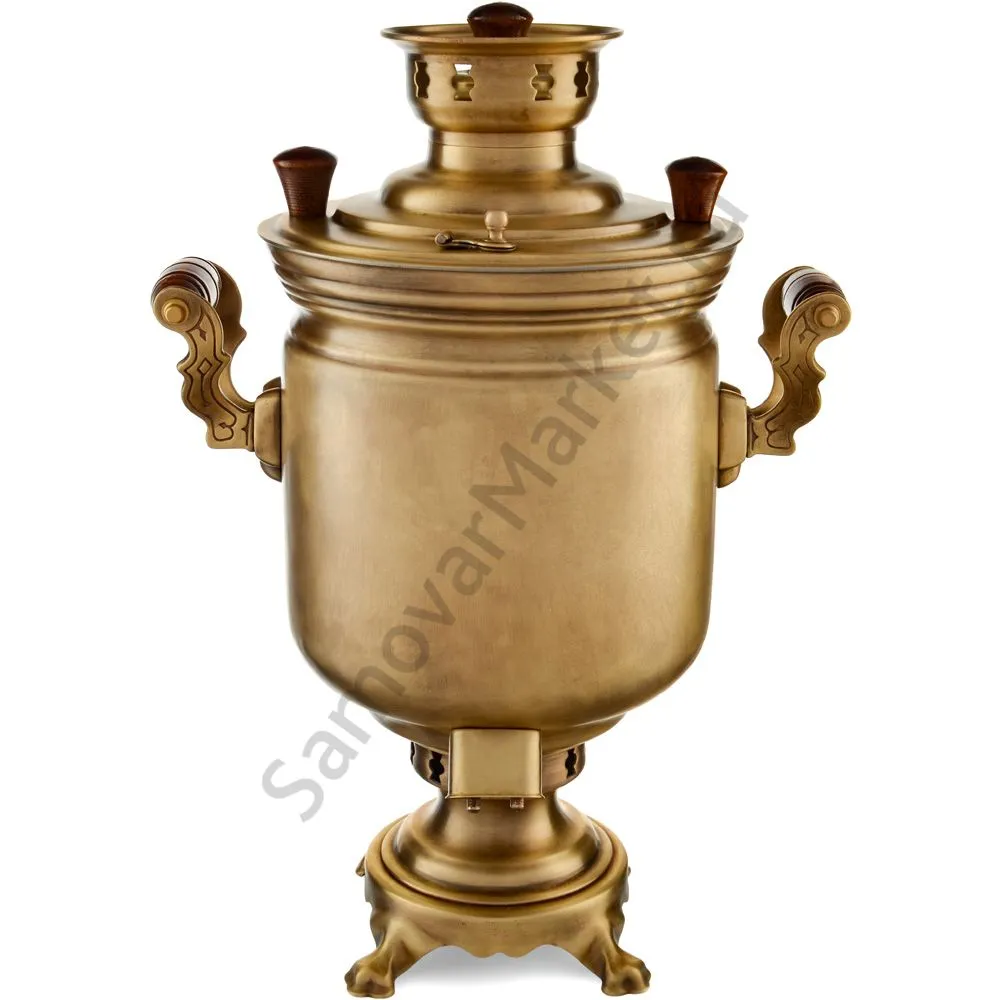 Этот самовар работает на дровах, углях, шишках, щепе. Топится он при помощи трубы, которая устанавливается сверху для образования тяги. Или при помощи сапога в качестве мехов. Внутренние стенки покрыты пищевым оловом методом гальваники.