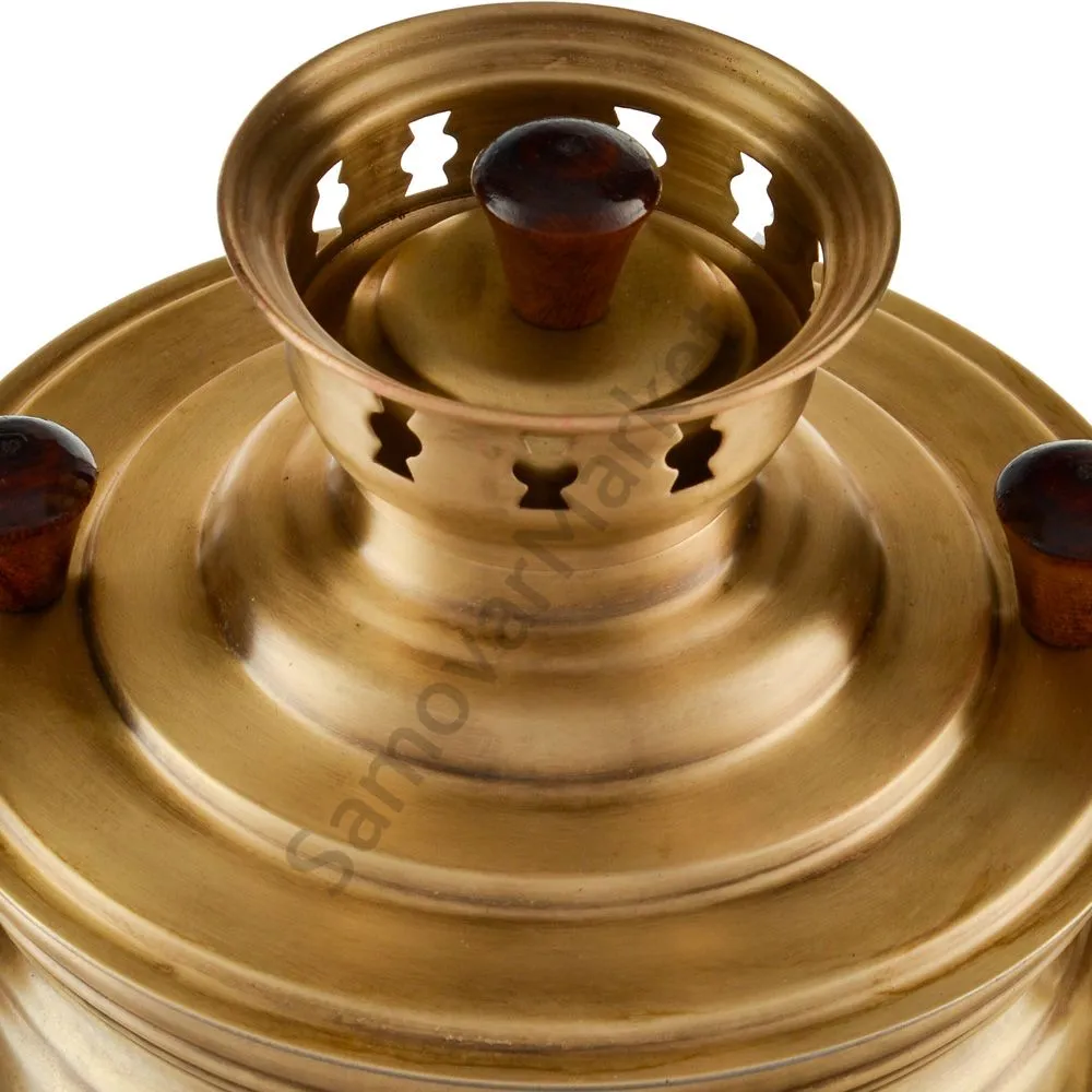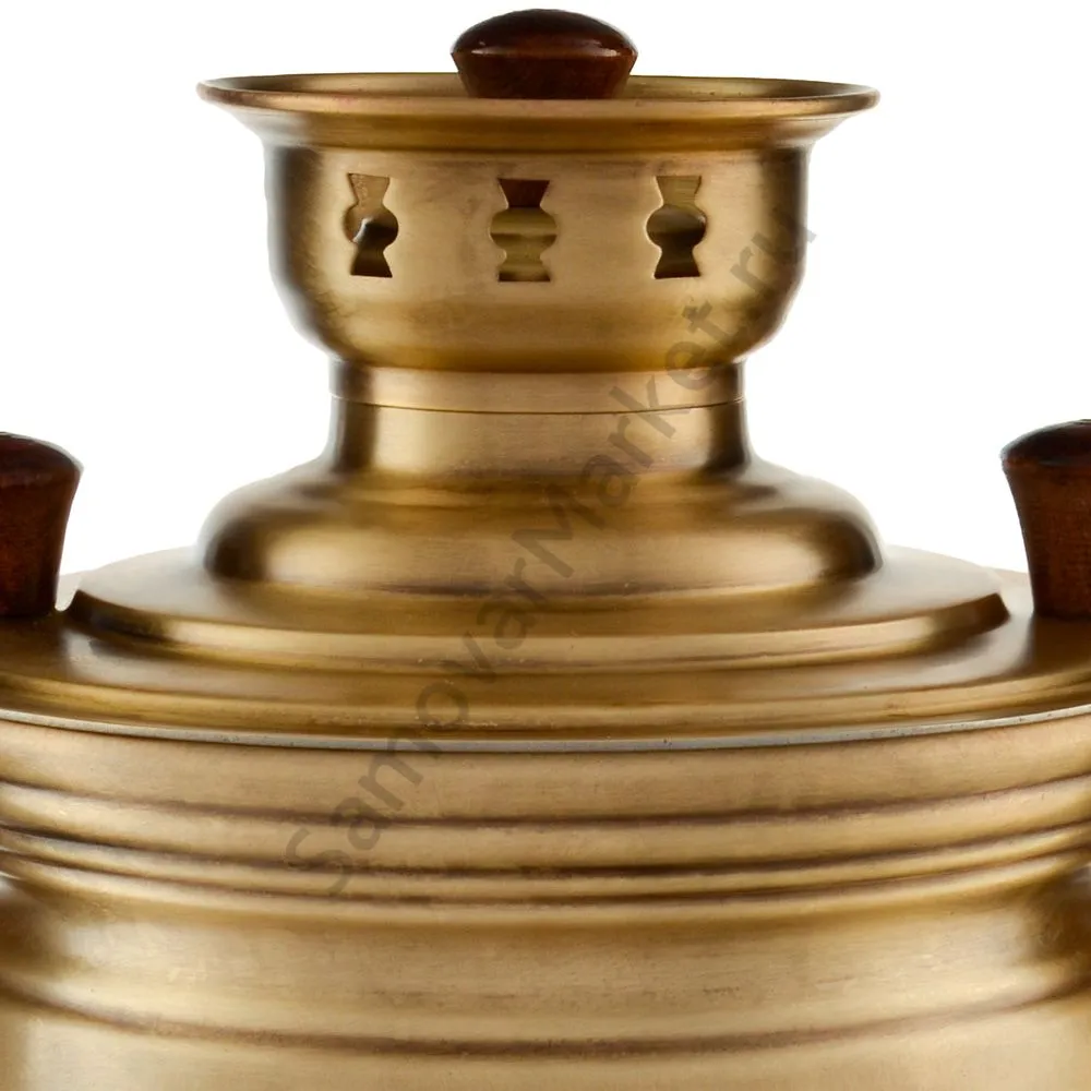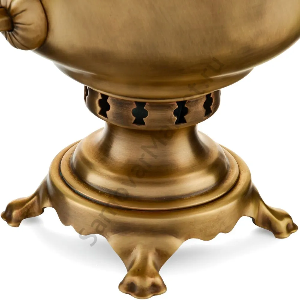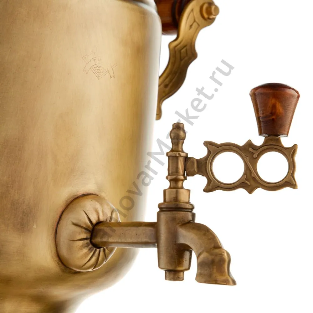 Этот самовар работает на дровах, углях, шишках, щепе. Топится он при помощи трубы, которая устанавливается сверху для образования тяги. Или при помощи сапога в качестве мехов. Внутренние стенки покрыты пищевым оловом методом гальваники.