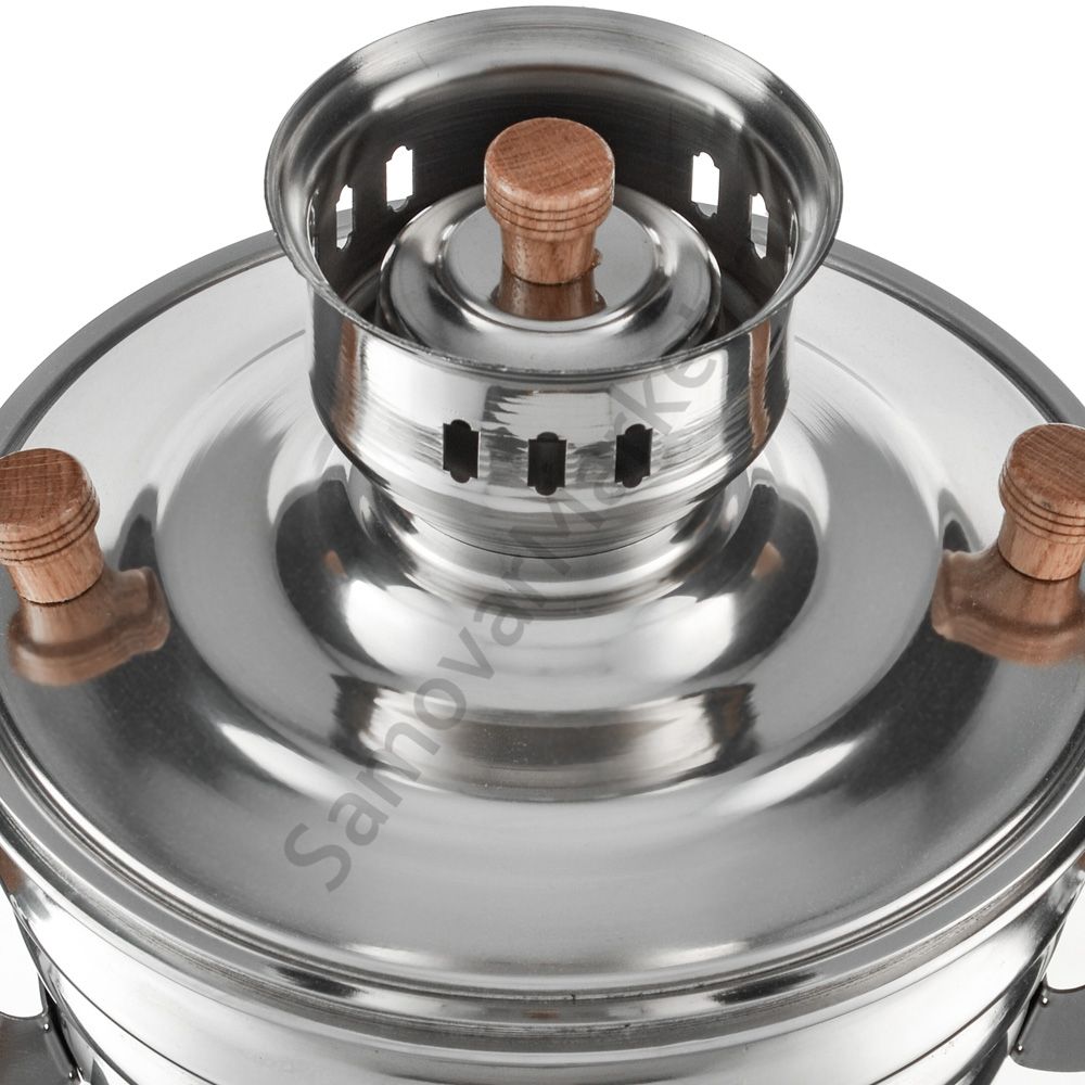 Ручки и хватки изготовлены из натурального дерева – берёзы, устойчивой к перепаду температур. Дерево затонировано в благородный и универсальный цвет с красивыми переливами специальной жароустойчивой краской и лаком. Полностью готов к применению. Изготовлено из нержавеющей стали, материала отлично сочетающегося с никелем по цвету. Как и никелированные самовары, нержавейка не тускнеет и не требует особого ухода. Сделано в России!