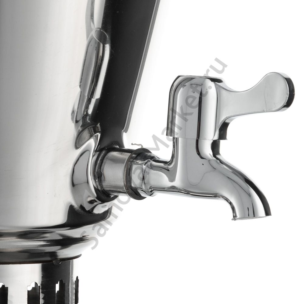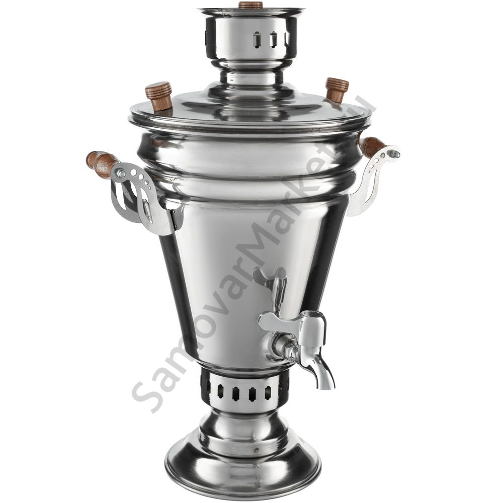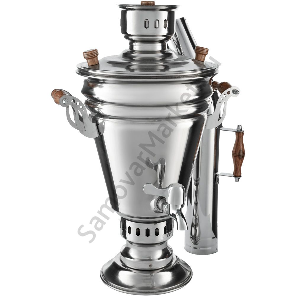 Этот самовар работает на дровах, углях, шишках, щепе. Топится он при помощи трубы, которая устанавливается сверху для образования тяги. Или при помощи сапога в качестве мехов. Внутренние стенки покрыты пищевым оловом методом гальваники.