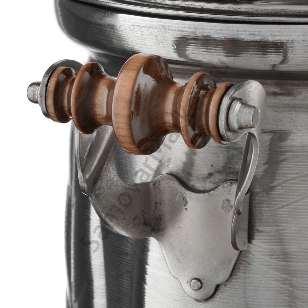 Этот самовар работает на дровах, углях, шишках, щепе. Топится он при помощи трубы, которая устанавливается сверху для образования тяги. Или при помощи сапога в качестве мехов. Внутренние стенки покрыты пищевым оловом методом гальваники.