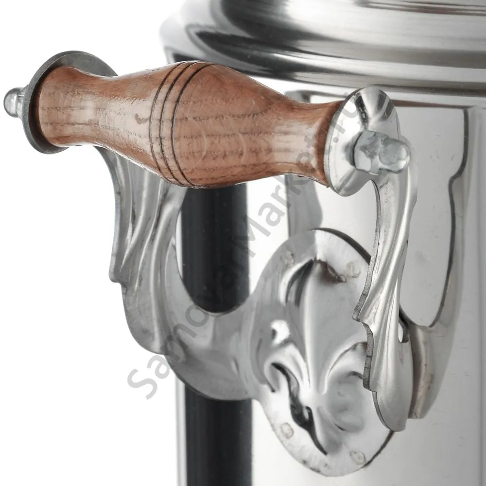 Ручки и хватки изготовлены из натурального дерева – берёзы, устойчивой к перепаду температур. Дерево затонировано в благородный и универсальный цвет с красивыми переливами специальной жароустойчивой краской и лаком. Полностью готов к применению. Изготовлено из нержавеющей стали, материала отлично сочетающегося с никелем по цвету. Как и никелированные самовары, нержавейка не тускнеет и не требует особого ухода. Сделано в России!