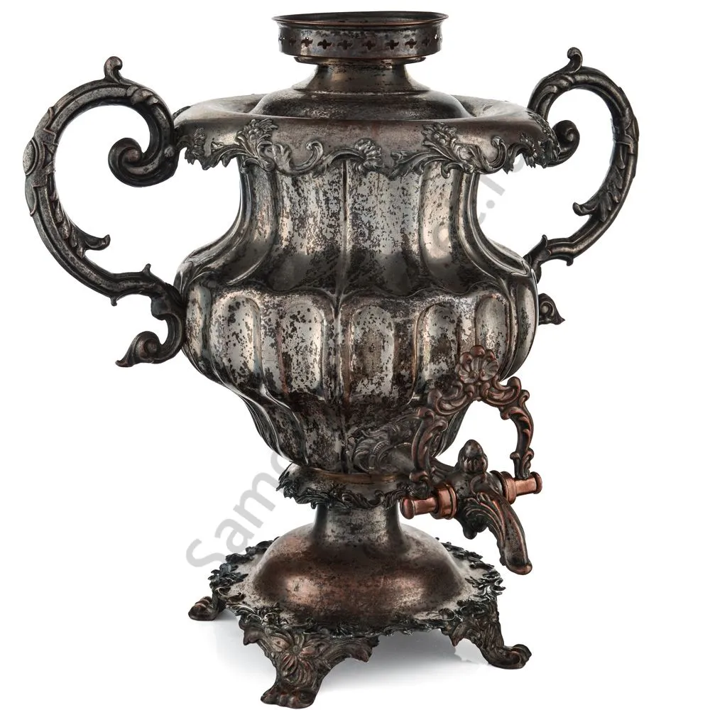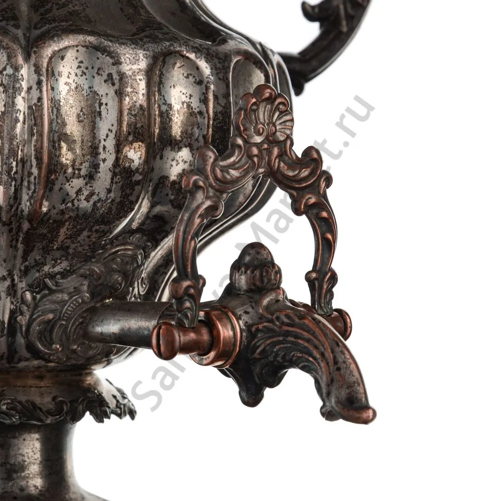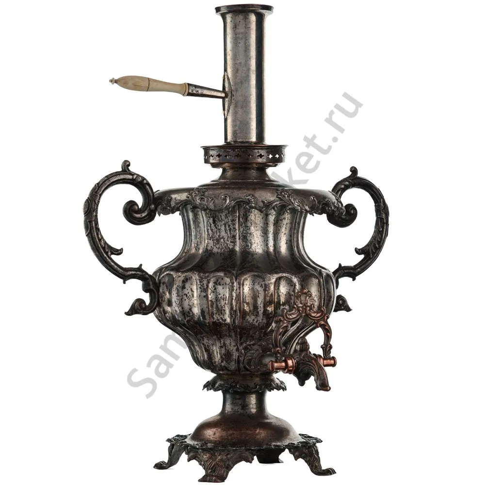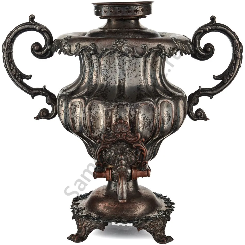Самовар в форме Вазы с узкими овалами. Ручки изогнутые, вертикальные, с рельефным растительным орнаментом. Репеёк стилизован под розетку цветка. Кран с рельефными желобками. Ветка в виде скобы с рельефным растительным орнаментом. безподдувальный, шейка и поддон гладкие. Нижний край с рельефным растительным орнаментом. Ножки плоские, широкие, рельефные.