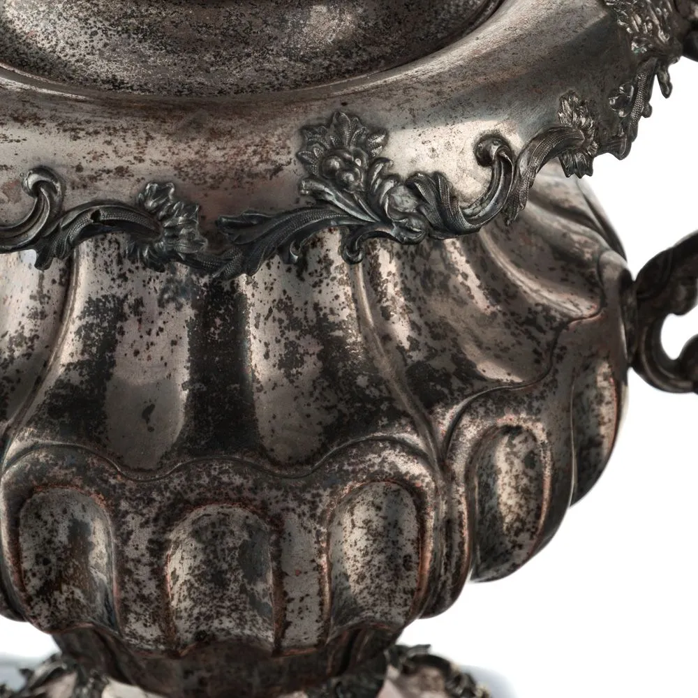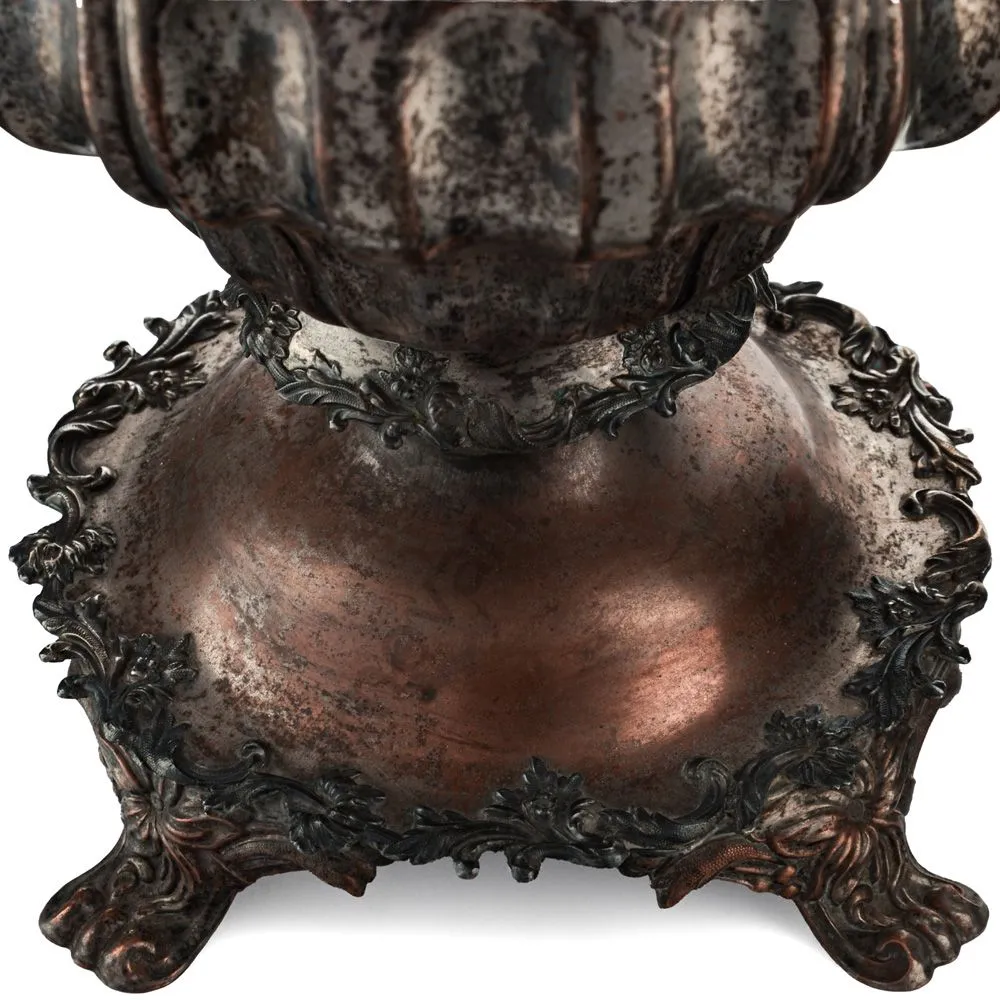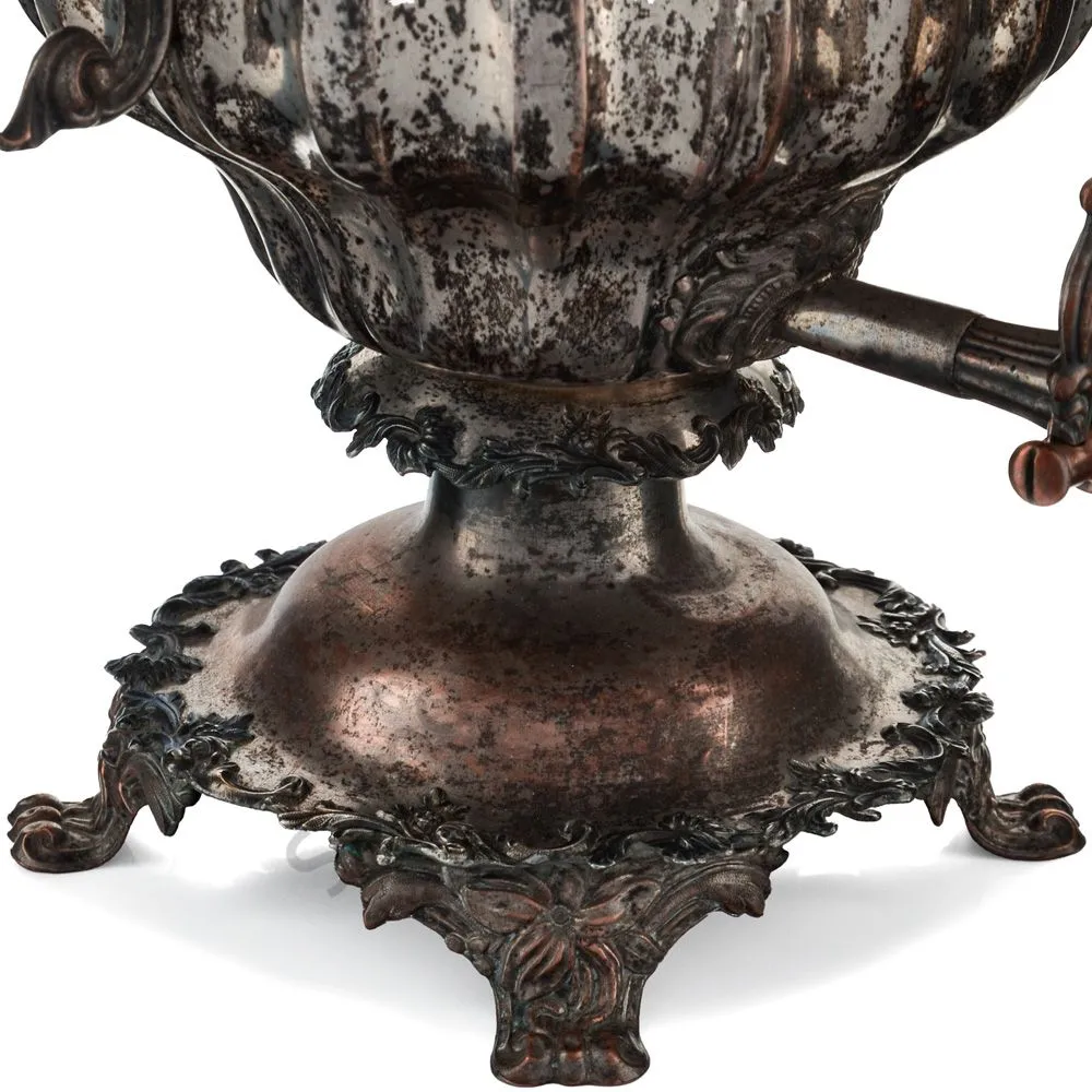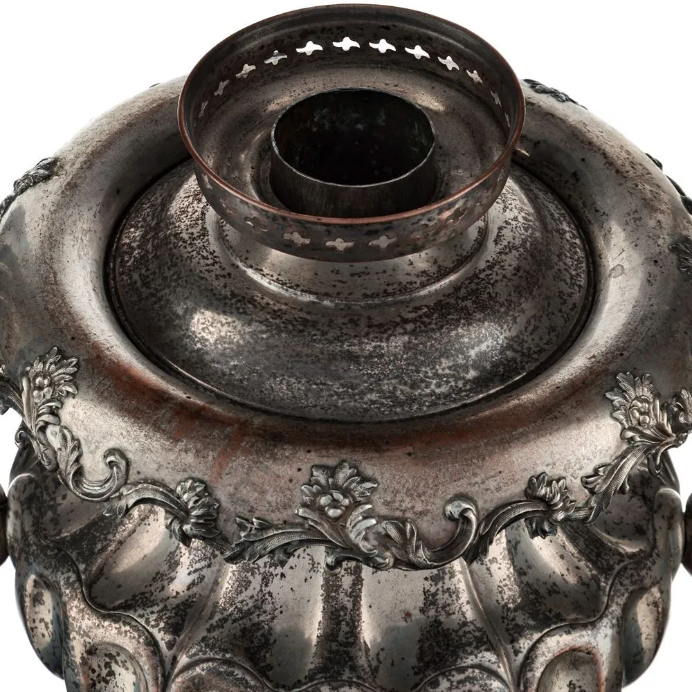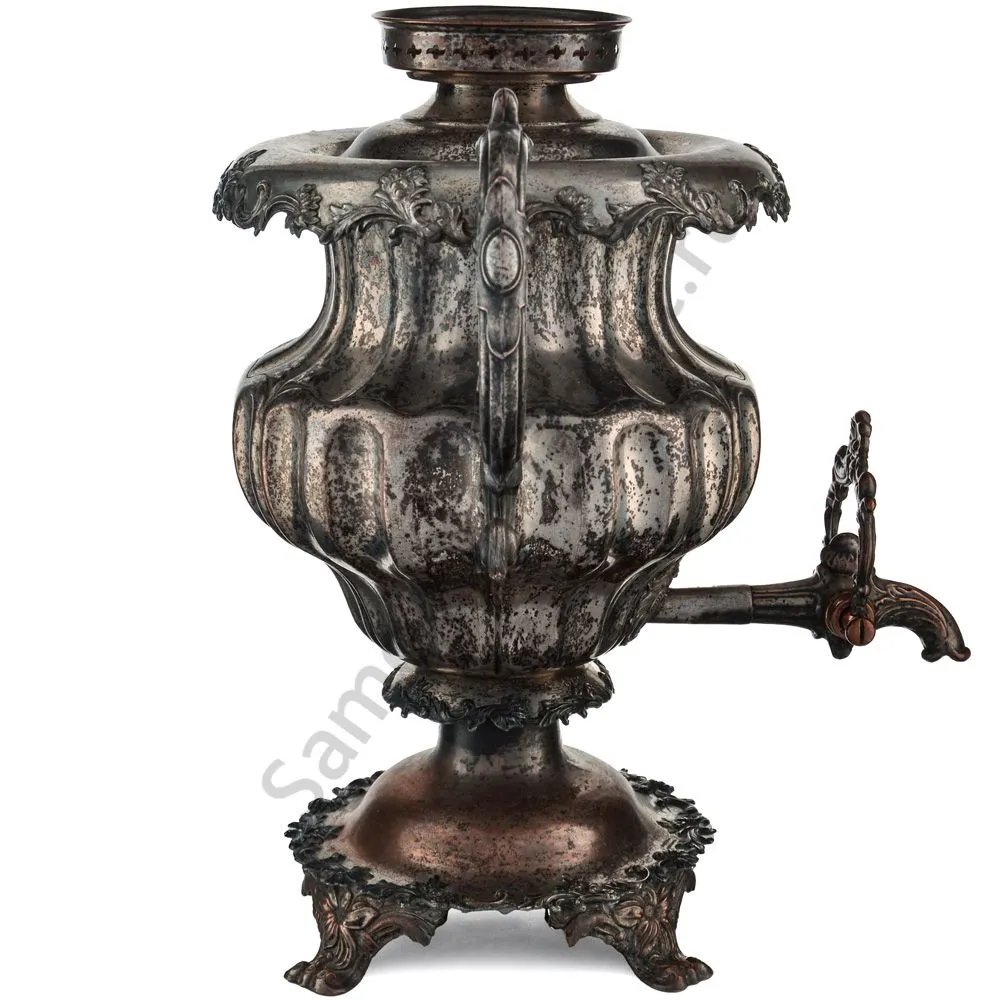 Самовар в форме Вазы с узкими овалами. Ручки изогнутые, вертикальные, с рельефным растительным орнаментом. Репеёк стилизован под розетку цветка. Кран с рельефными желобками. Ветка в виде скобы с рельефным растительным орнаментом. безподдувальный, шейка и поддон гладкие. Нижний край с рельефным растительным орнаментом. Ножки плоские, широкие, рельефные.