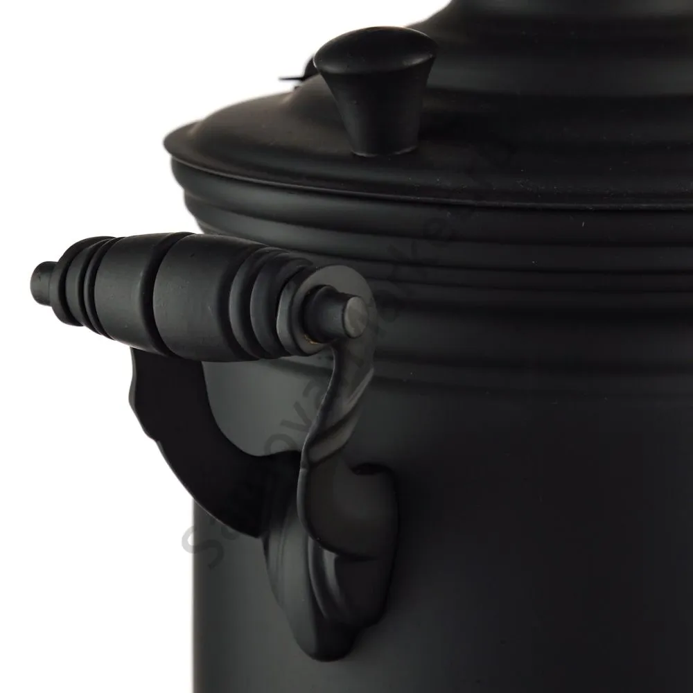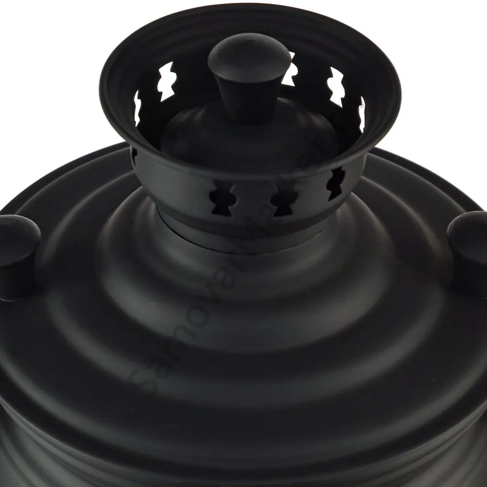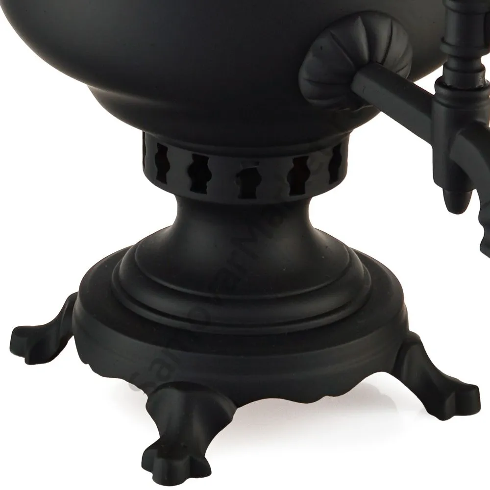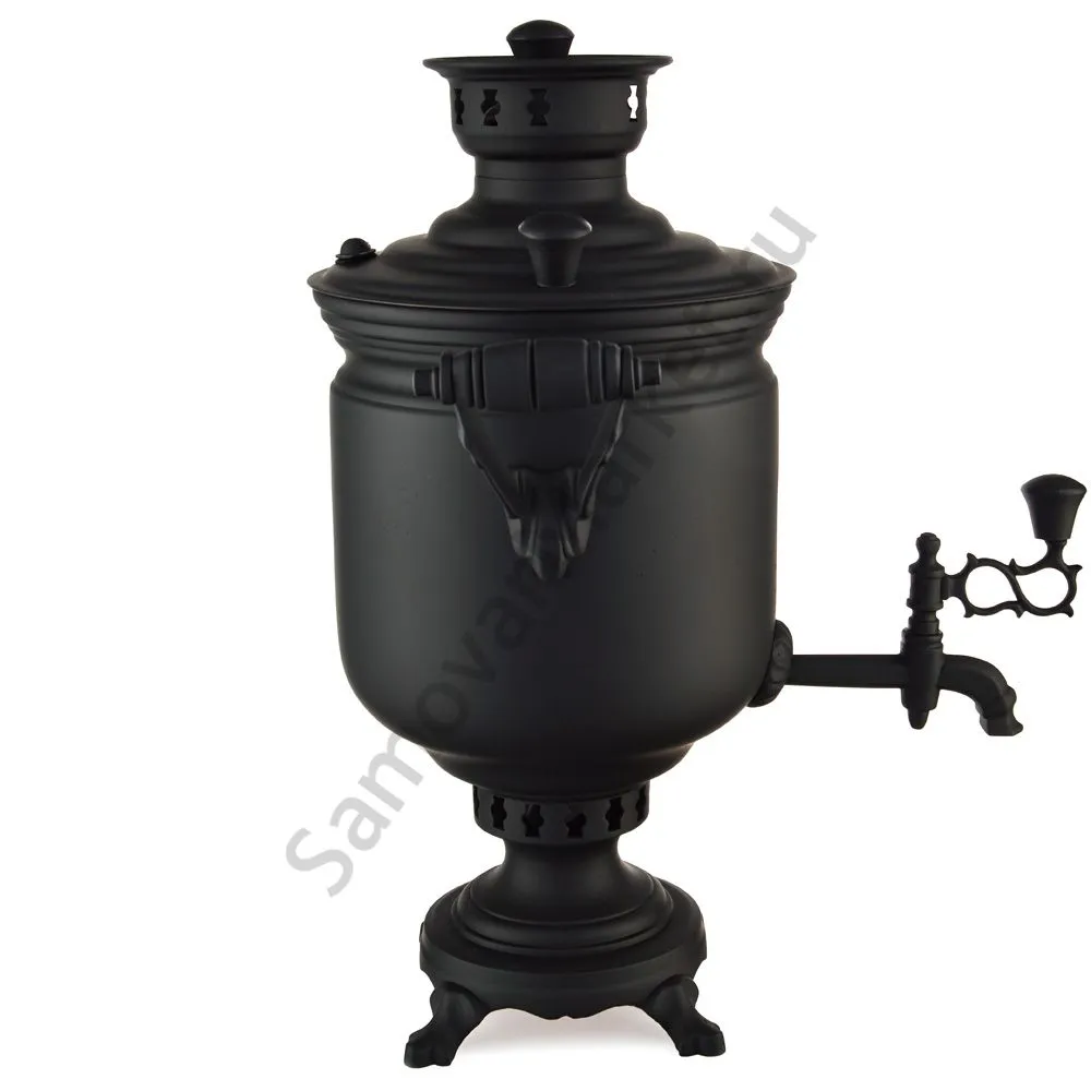 Этот самовар работает на дровах, углях, шишках, щепе. Топится он при помощи трубы, которая устанавливается сверху для образования тяги. Или при помощи сапога в качестве мехов. Внутренние стенки покрыты пищевым оловом методом гальваники.
