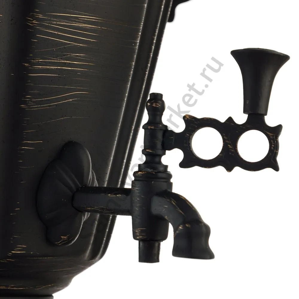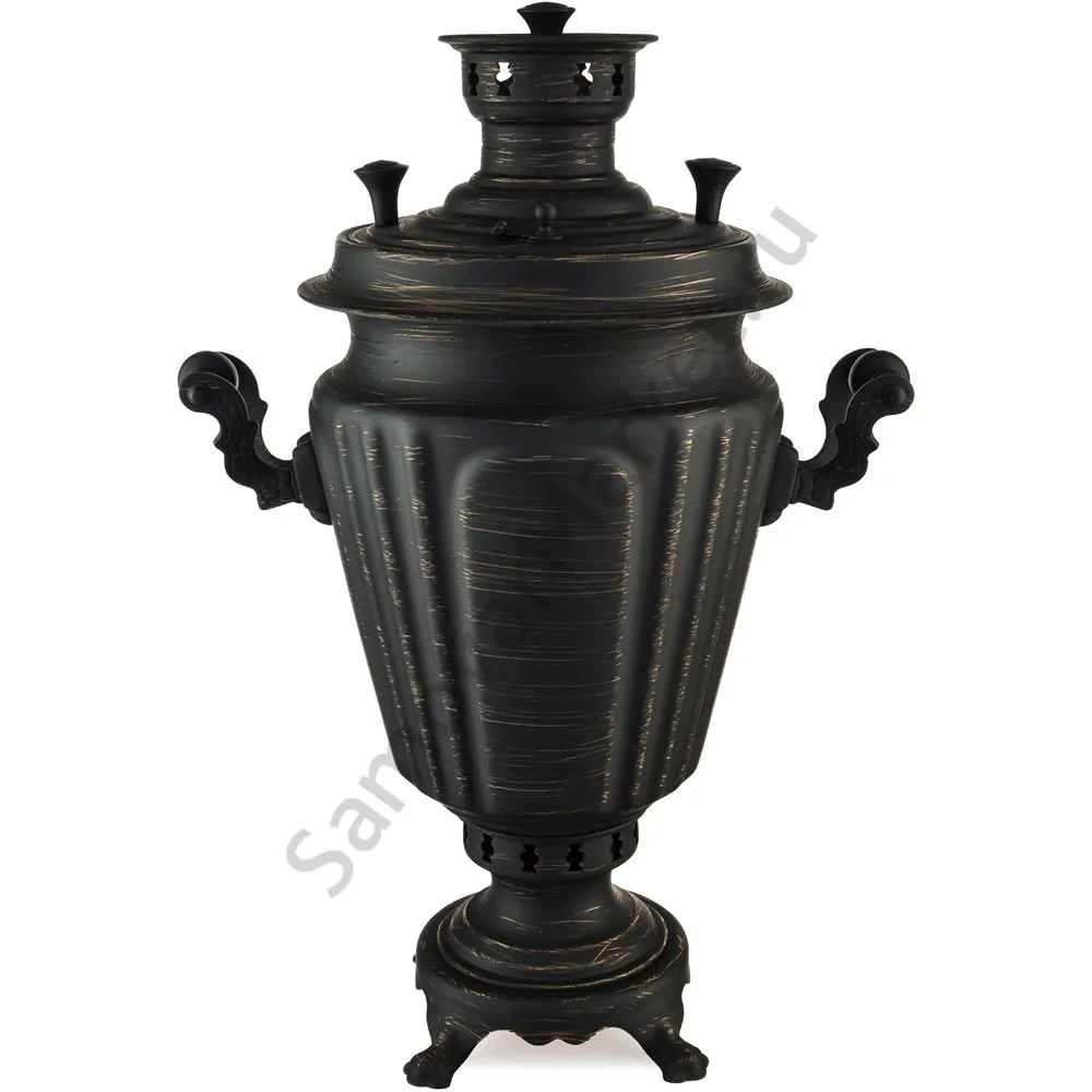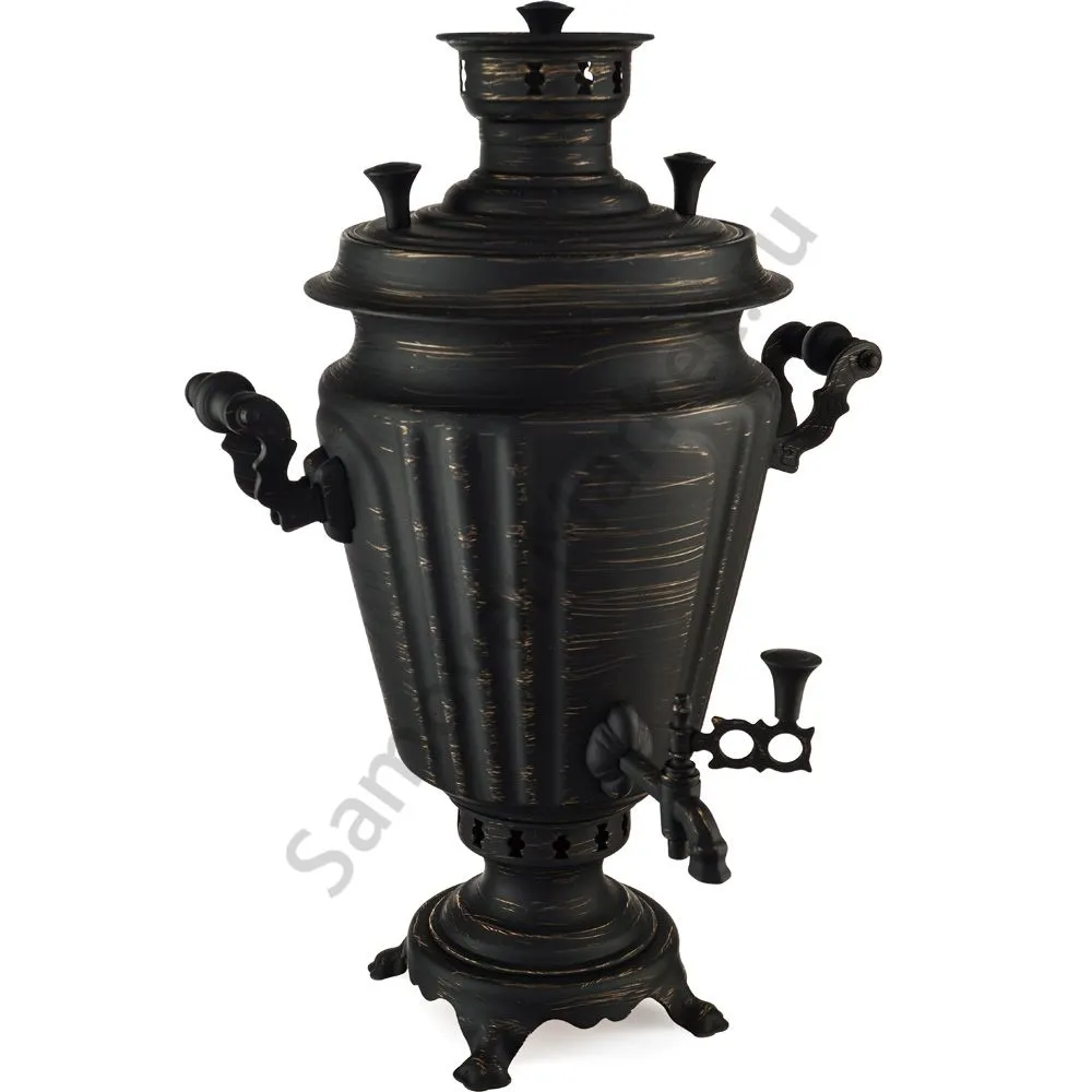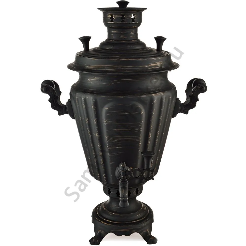 Этот самовар работает на дровах, углях, шишках, щепе. Топится он при помощи трубы, которая устанавливается сверху для образования тяги. Или при помощи сапога в качестве мехов. Внутренние стенки покрыты пищевым оловом методом гальваники.