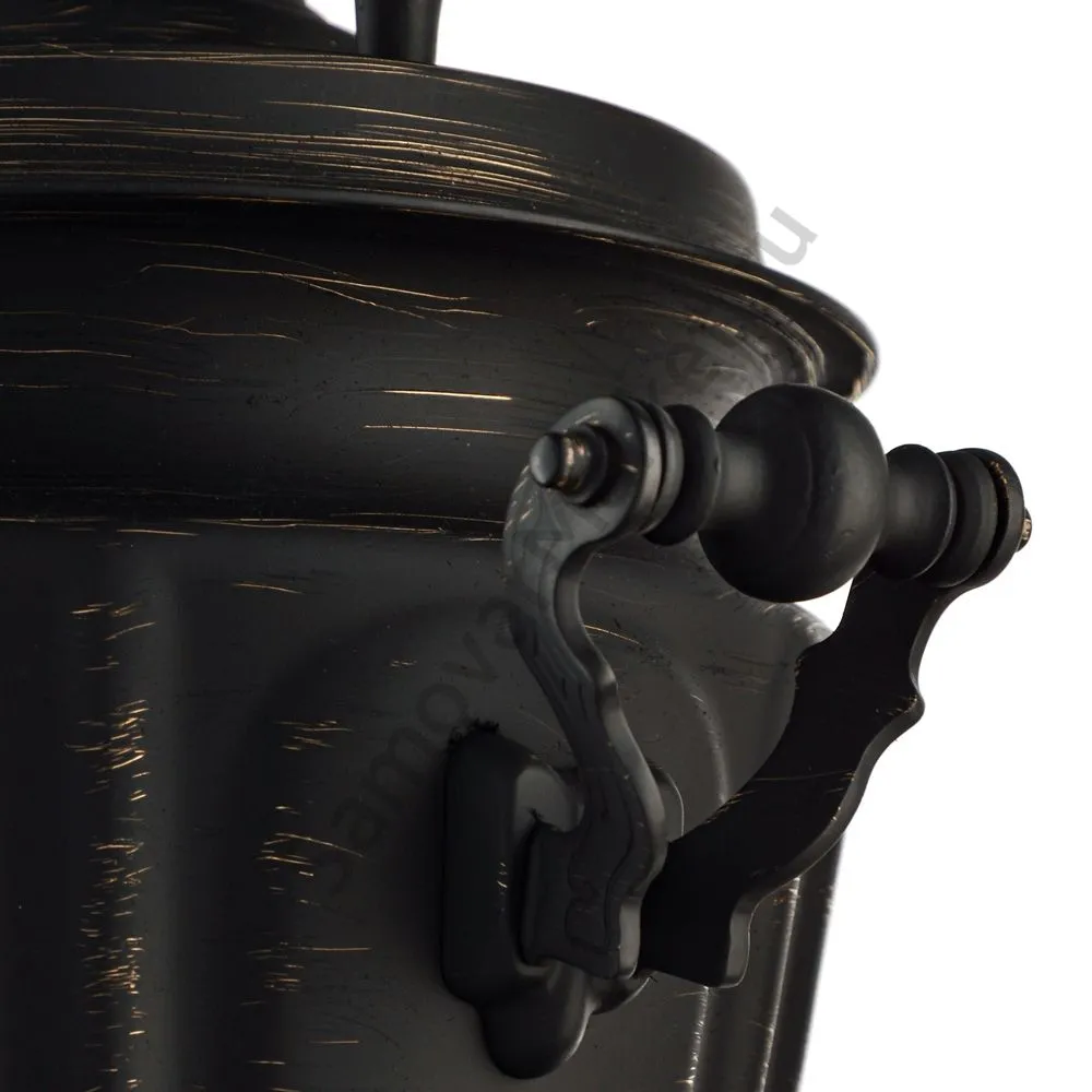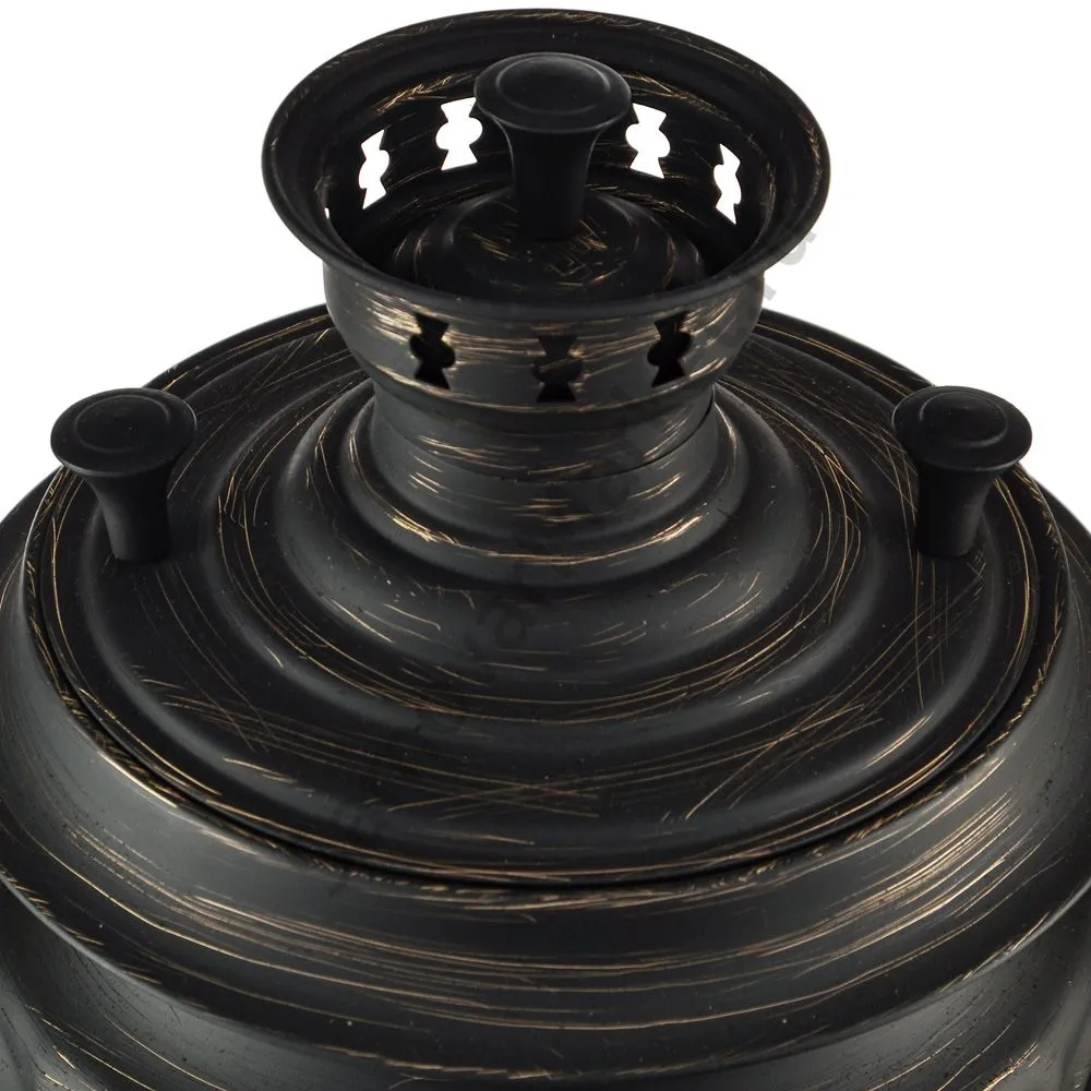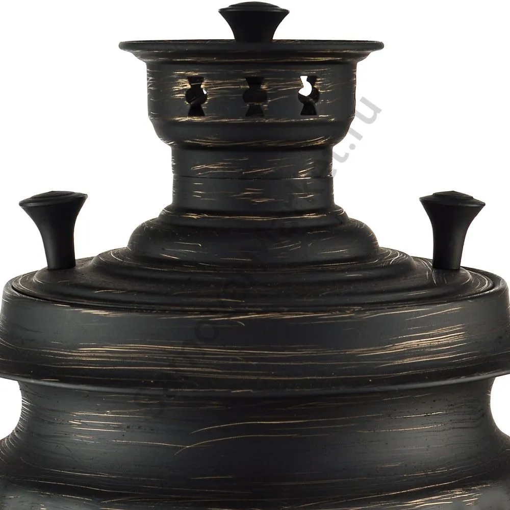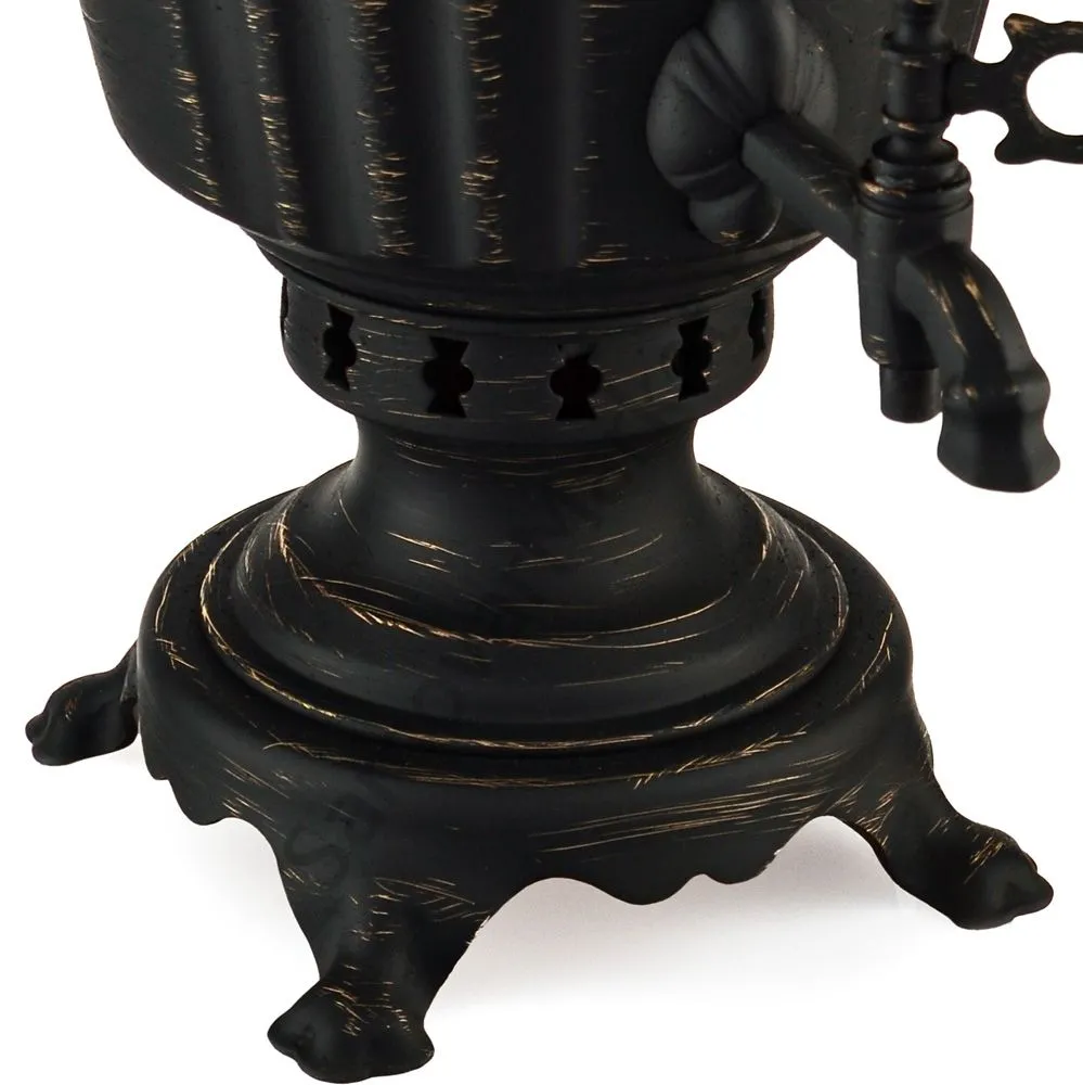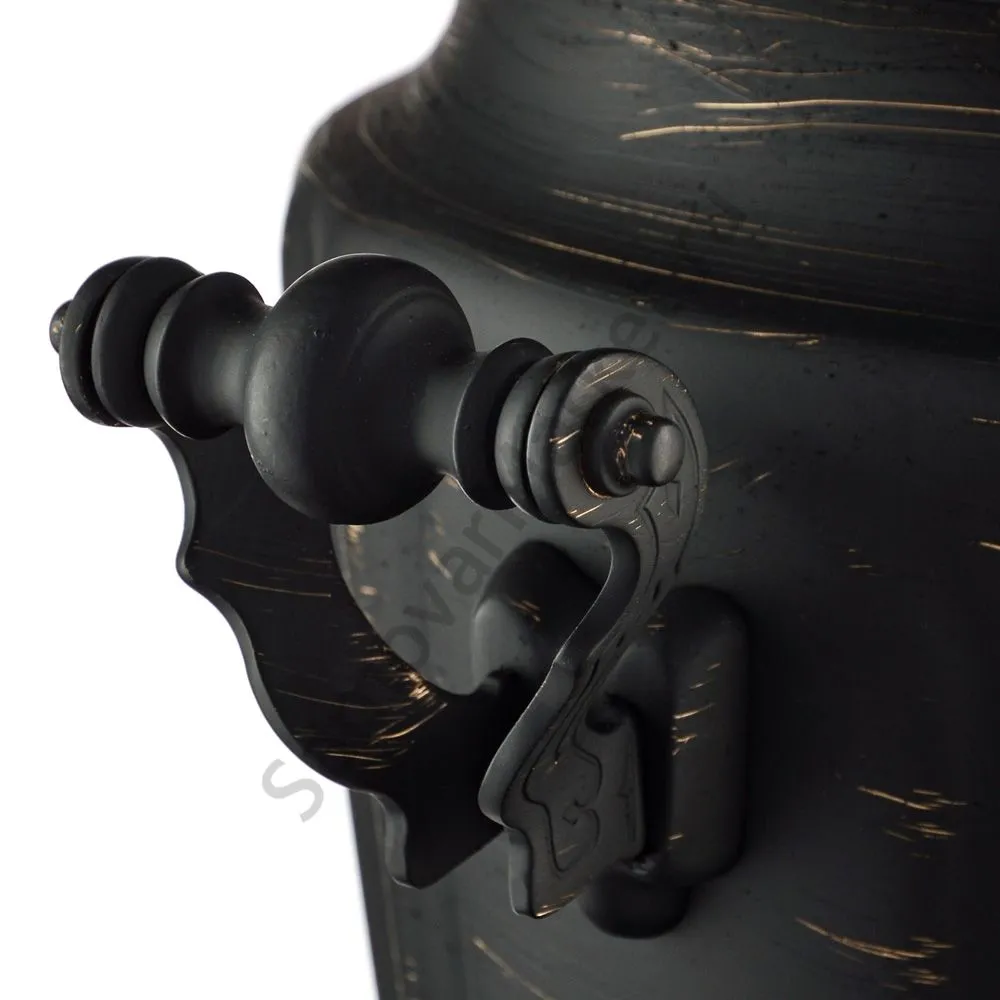 Этот самовар работает на дровах, углях, шишках, щепе. Топится он при помощи трубы, которая устанавливается сверху для образования тяги. Или при помощи сапога в качестве мехов. Внутренние стенки покрыты пищевым оловом методом гальваники.