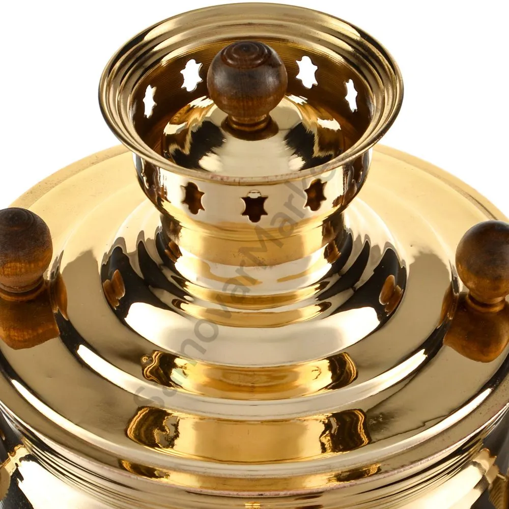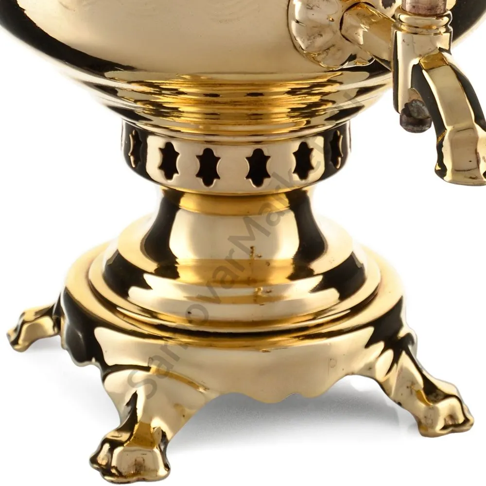 Этот самовар работает на дровах, углях, шишках, щепе. Топится он при помощи трубы, которая устанавливается сверху для образования тяги. Или при помощи сапога в качестве мехов. Внутренние стенки покрыты пищевым оловом методом гальваники.