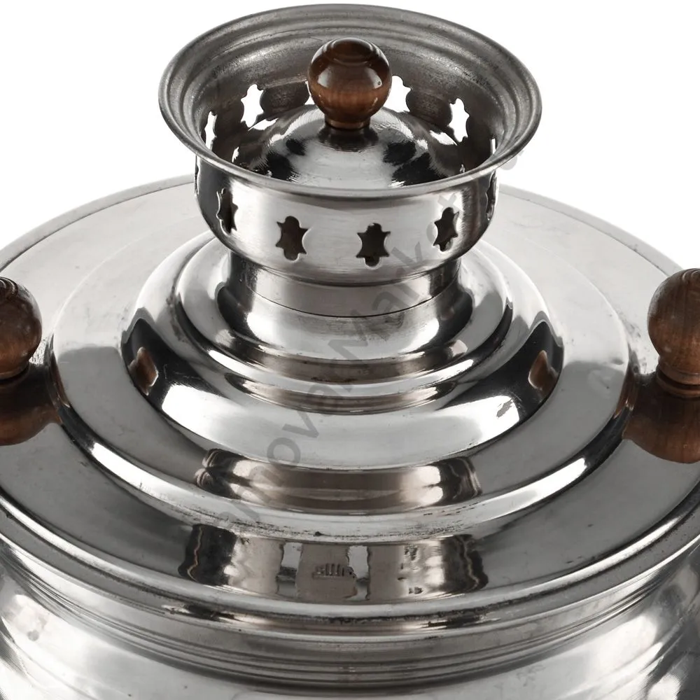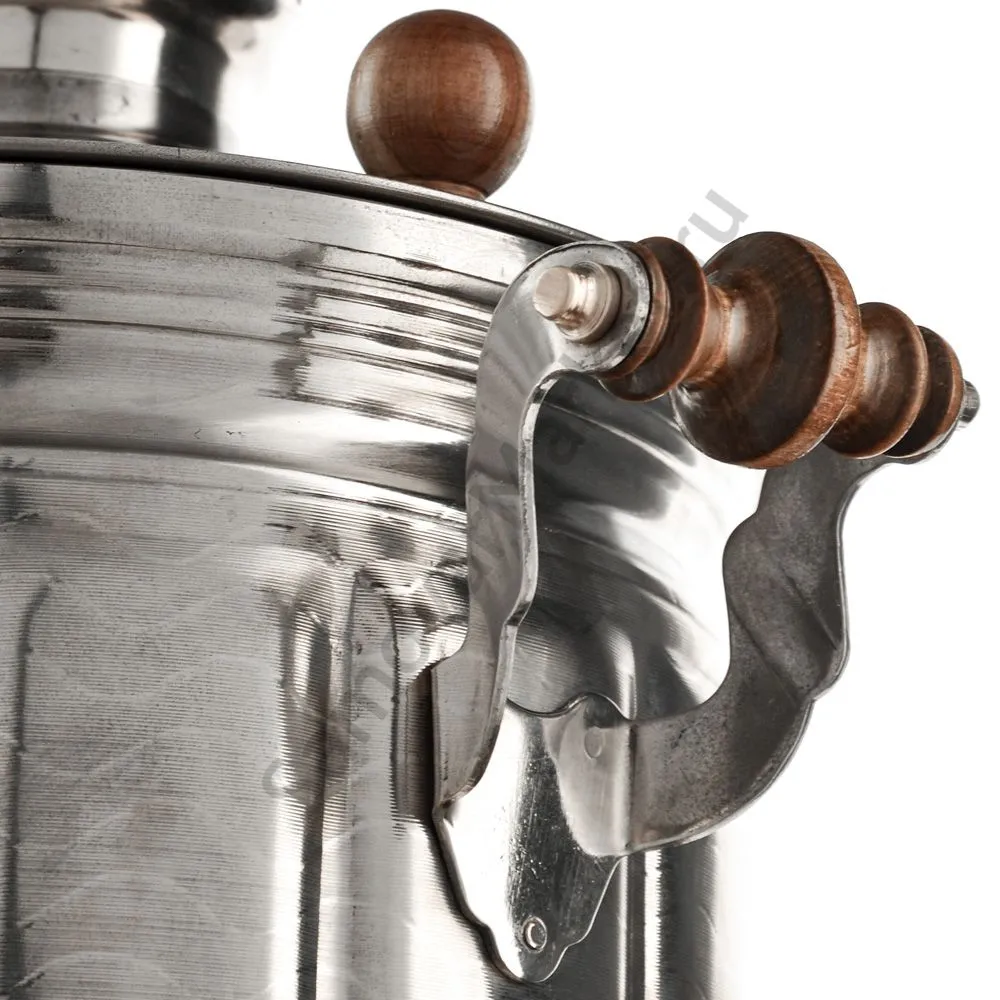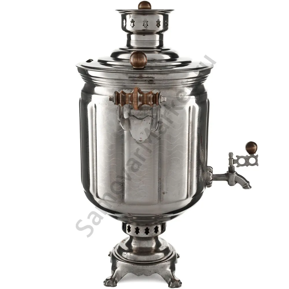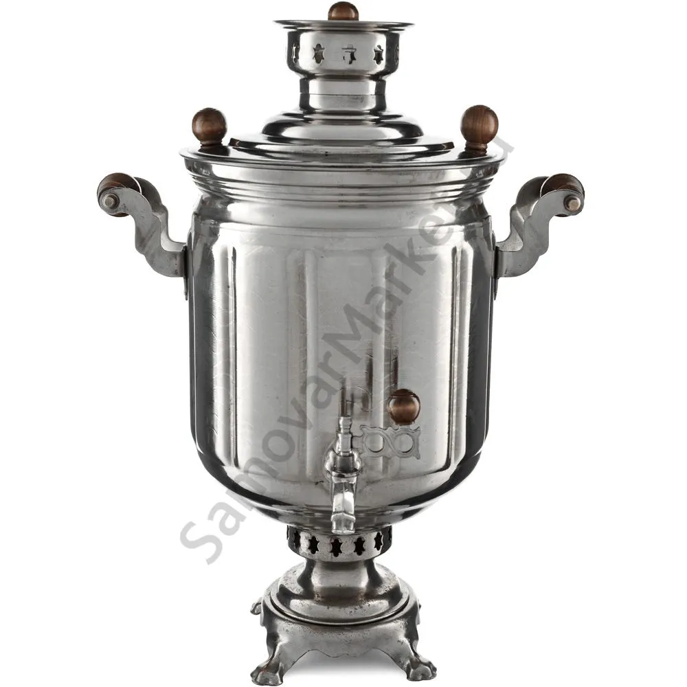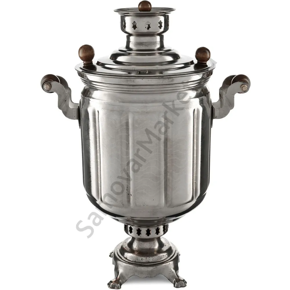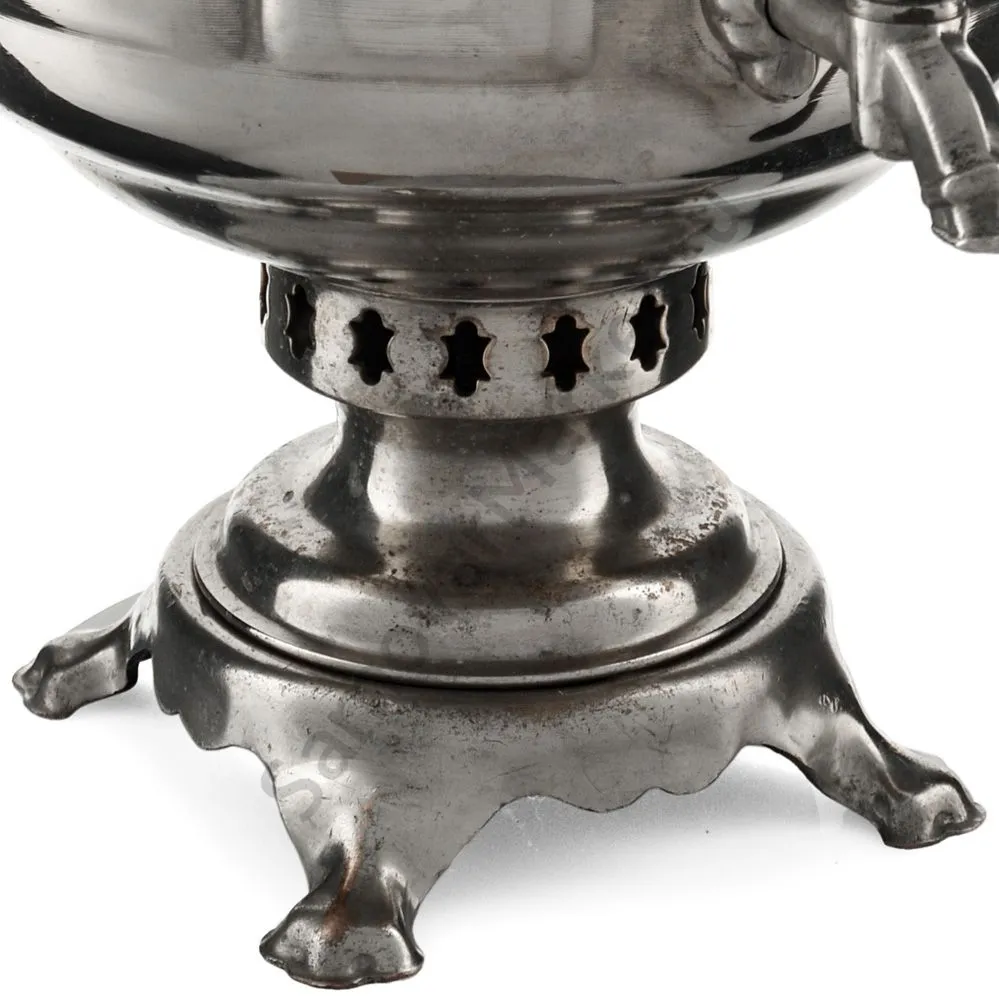 Этот самовар работает на дровах, углях, шишках, щепе. Топится он при помощи трубы, которая устанавливается сверху для образования тяги. Или при помощи сапога в качестве мехов. Внутренние стенки покрыты пищевым оловом методом гальваники.