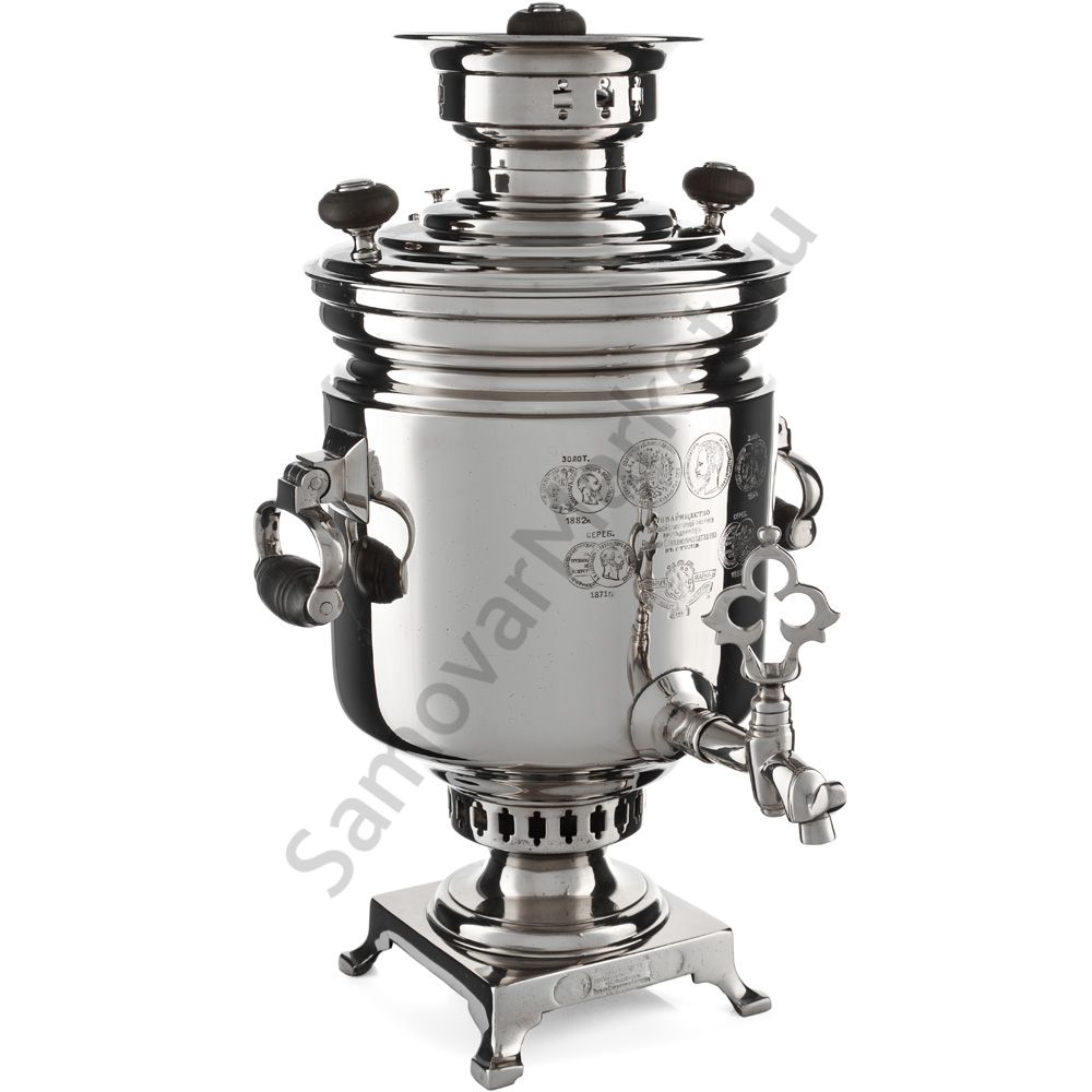Этот самовар работает на дровах, углях, шишках, щепе. Топится он при помощи трубы, которая устанавливается сверху для образования тяги. Или при помощи сапога в качестве мехов. Внутренние стенки покрыты пищевым оловом методом гальваники.