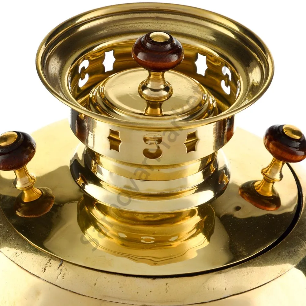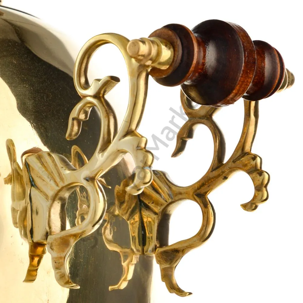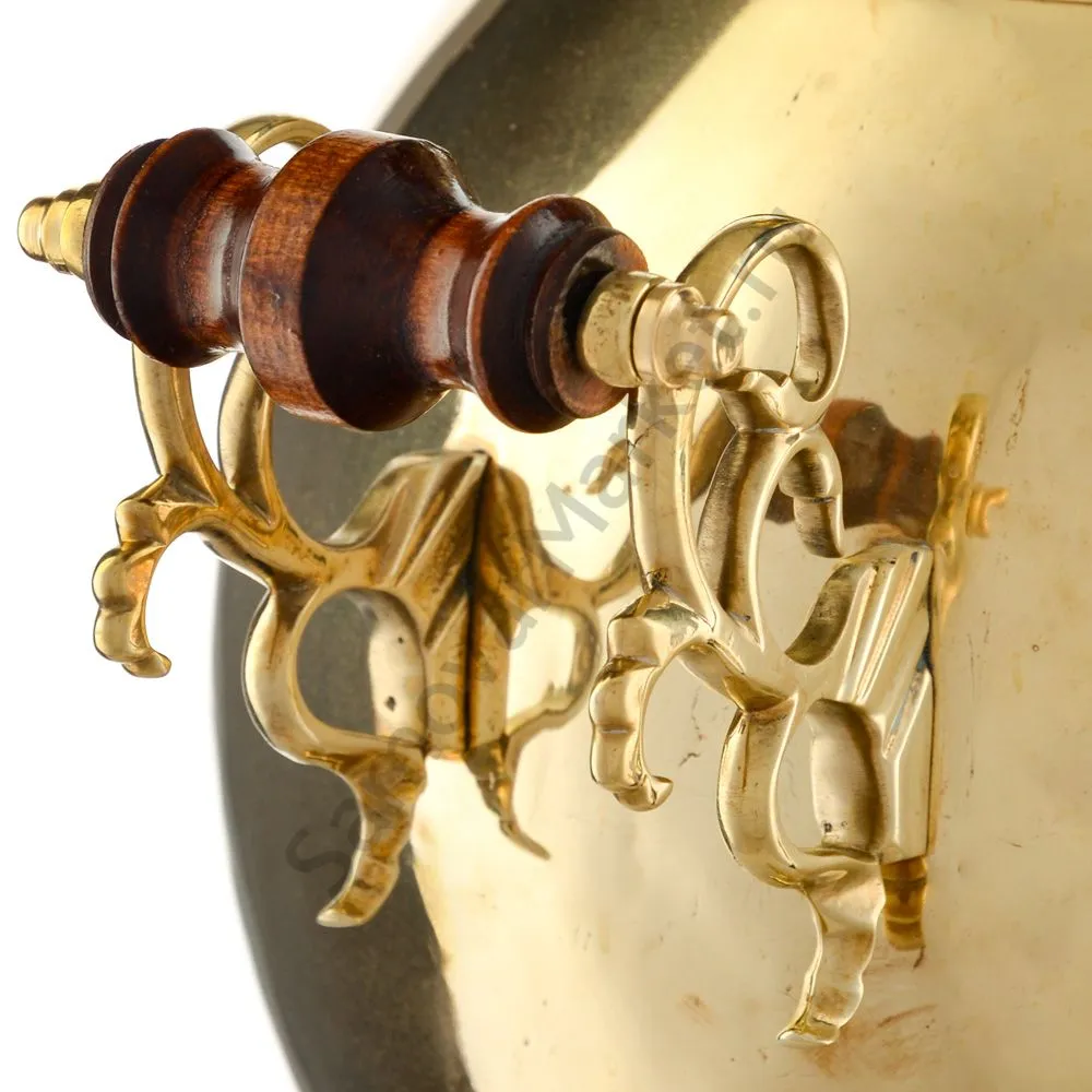 Ручки и хватки изготовлены из натурального дерева – берёзы, устойчивой к перепаду температур. Дерево окрашено специальными красками с эффектом благородной старины. Полностью готов к применению.Эта модель изготовлена из латуни. Рекомендуется полировка специальными средствами для поддержания блеска. Сделано в Туле.