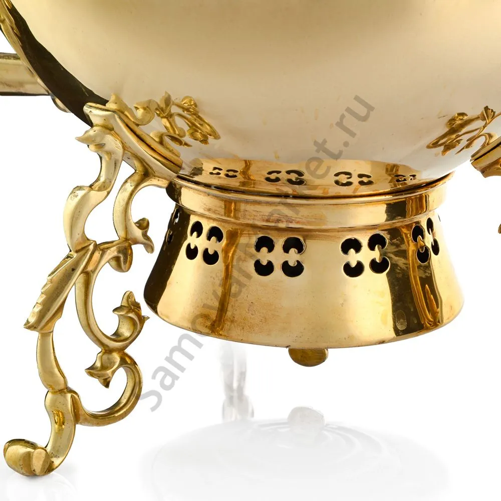 Этот самовар работает на дровах, углях, шишках, щепе. Топится он при помощи трубы, которая устанавливается сверху для образования тяги. Или при помощи сапога в качестве мехов. Внутренние стенки покрыты пищевым оловом методом гальваники.