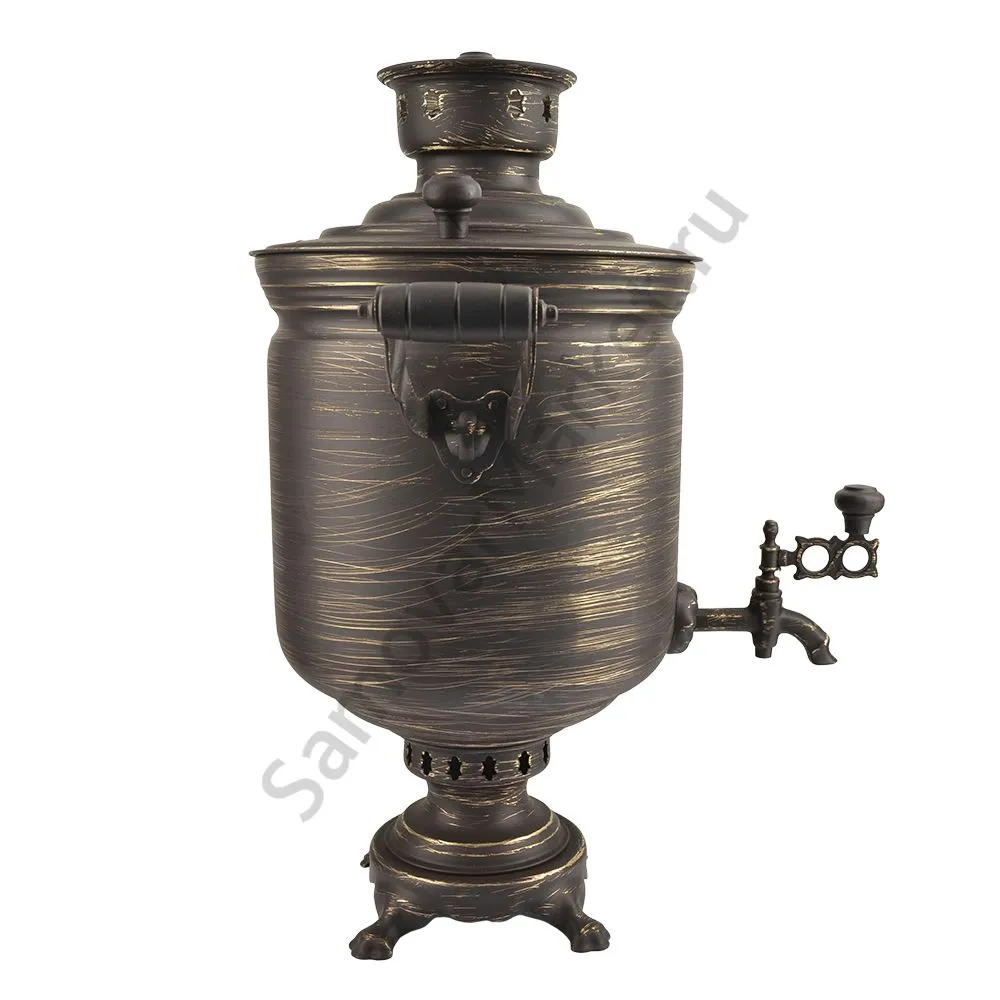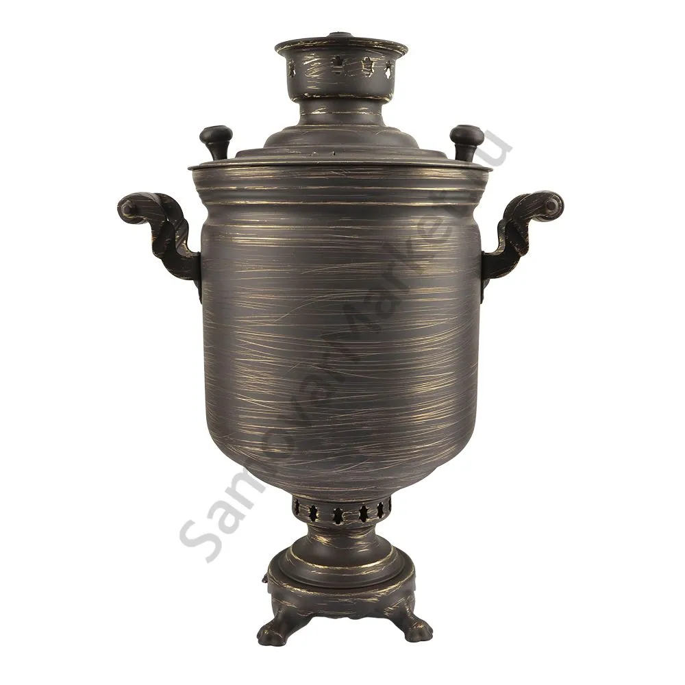 Этот самовар работает на дровах, углях, шишках, щепе. Топится он при помощи трубы, которая устанавливается сверху для образования тяги. Или при помощи сапога в качестве мехов. Внутренние стенки покрыты пищевым оловом методом гальваники.