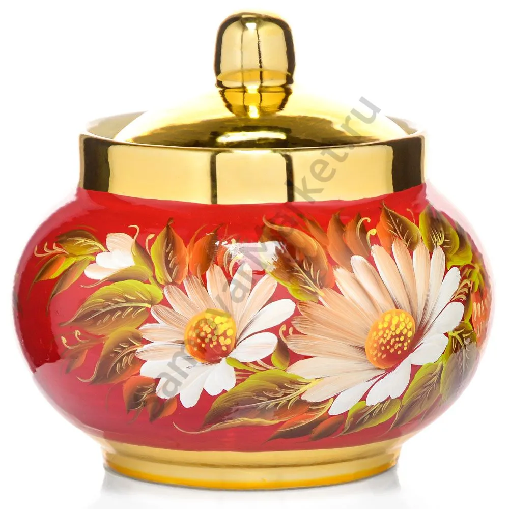 Сахарница с художественной росписью «Ромашки с клубникой в золоте»