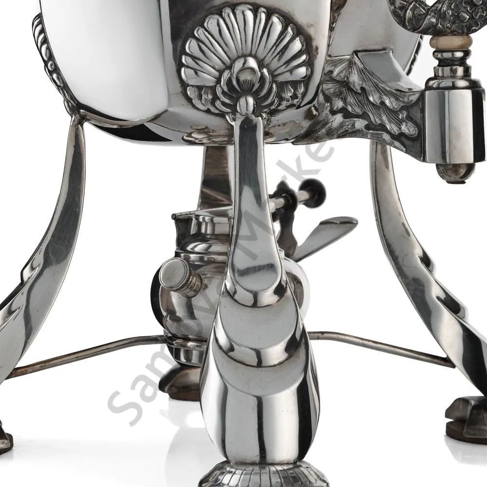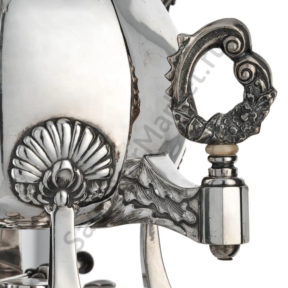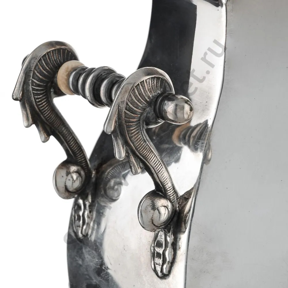 Ручки и хватки изготовлены из кости. В наших краях используется как кость – рог оленя. Это максимальн прочная фурнитура, которая украшает только самовары премиум сегмента. Прочность этого материала напрямую влияет на сложность его обработки. Самовар полностью готов к применению. Никелированные изделия из латуни – это красиво и практично. Единственный недостаток никелировки – они стоят немного дороже просто латунных. Но поверьте, сделав однажды выбор в пользу ни