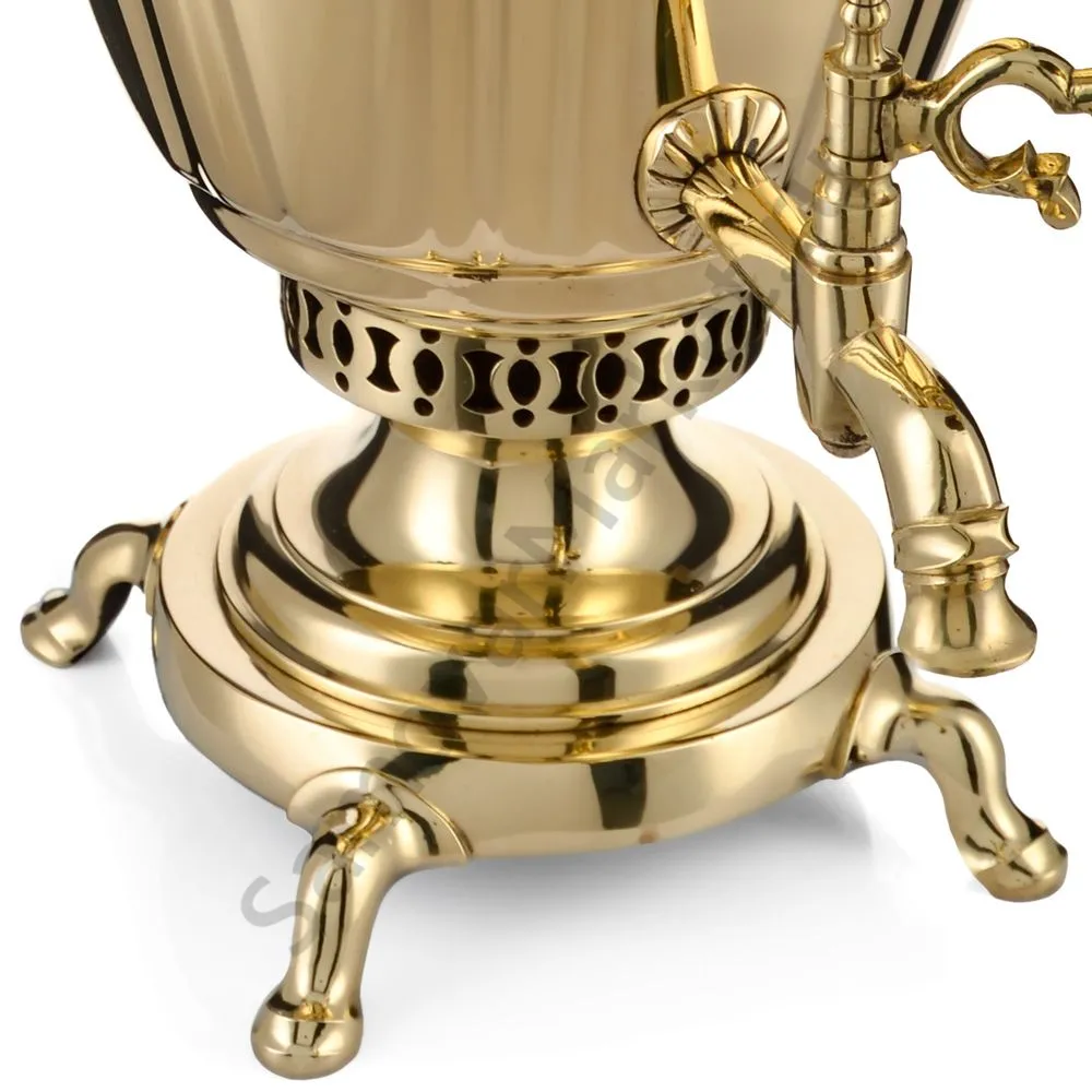 Этот самовар работает на дровах, углях, шишках, щепе. Топится он при помощи трубы, которая устанавливается сверху для образования тяги. Или при помощи сапога в качестве мехов. Внутренние стенки покрыты пищевым оловом методом гальваники.