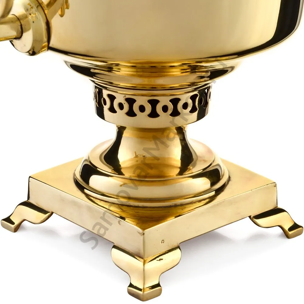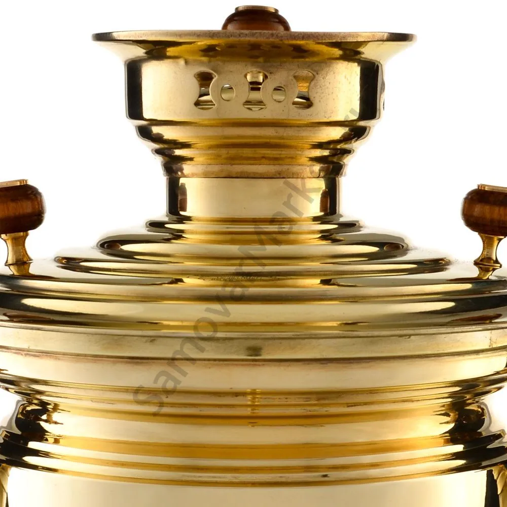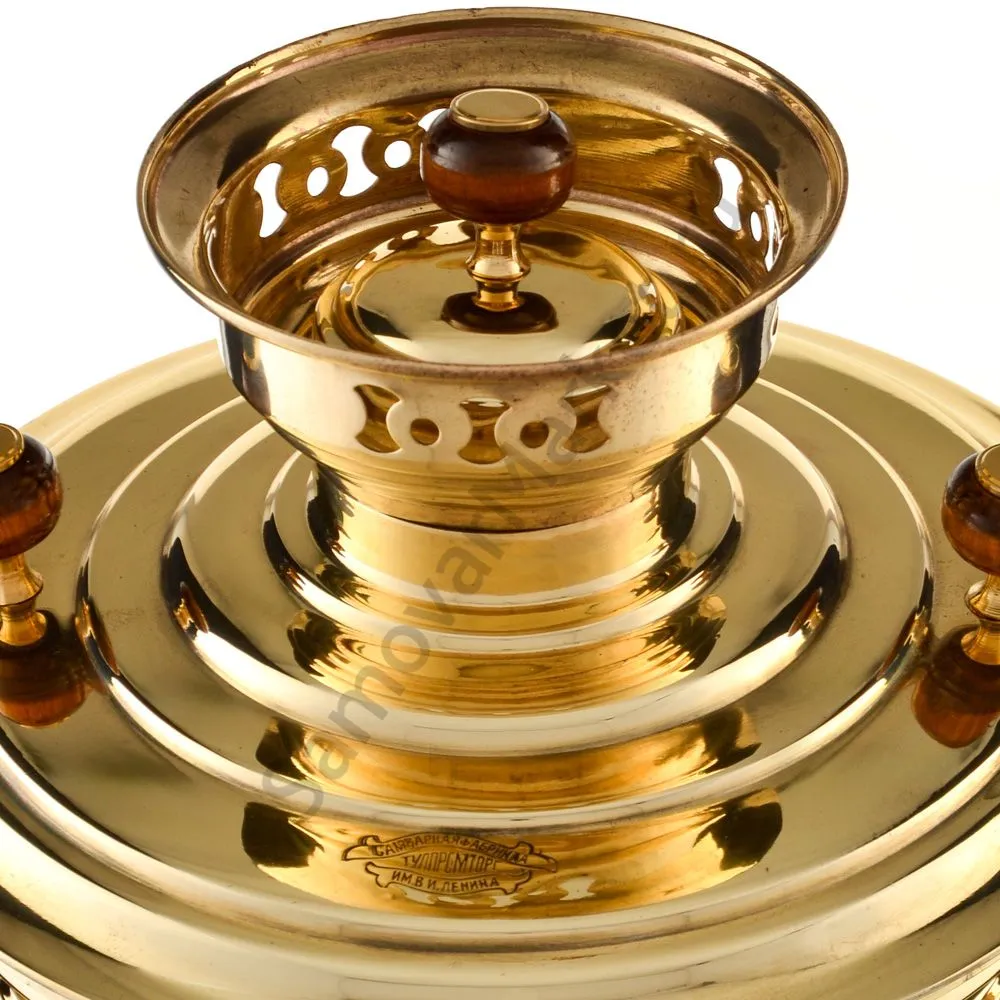 Этот самовар работает на дровах, углях, шишках, щепе. Топится он при помощи трубы, которая устанавливается сверху для образования тяги. Или при помощи сапога в качестве мехов. Внутренние стенки покрыты пищевым оловом методом гальваники.