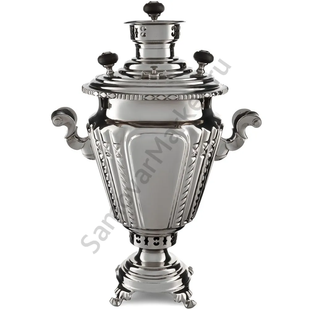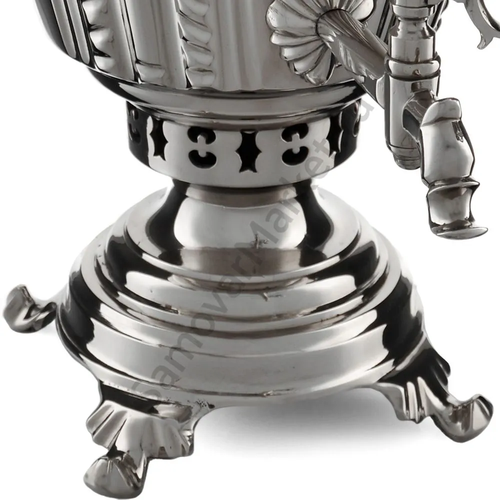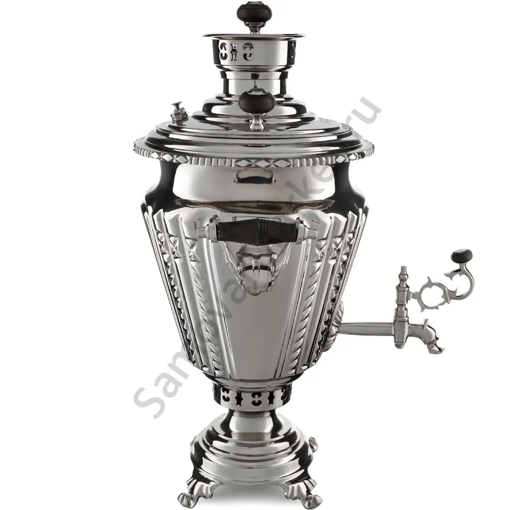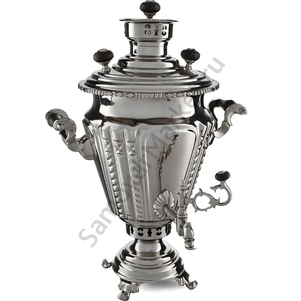 Этот самовар работает на дровах, углях, шишках, щепе. Топится он при помощи трубы, которая устанавливается сверху для образования тяги. Или при помощи сапога в качестве мехов. Внутренние стенки покрыты пищевым оловом методом гальваники.