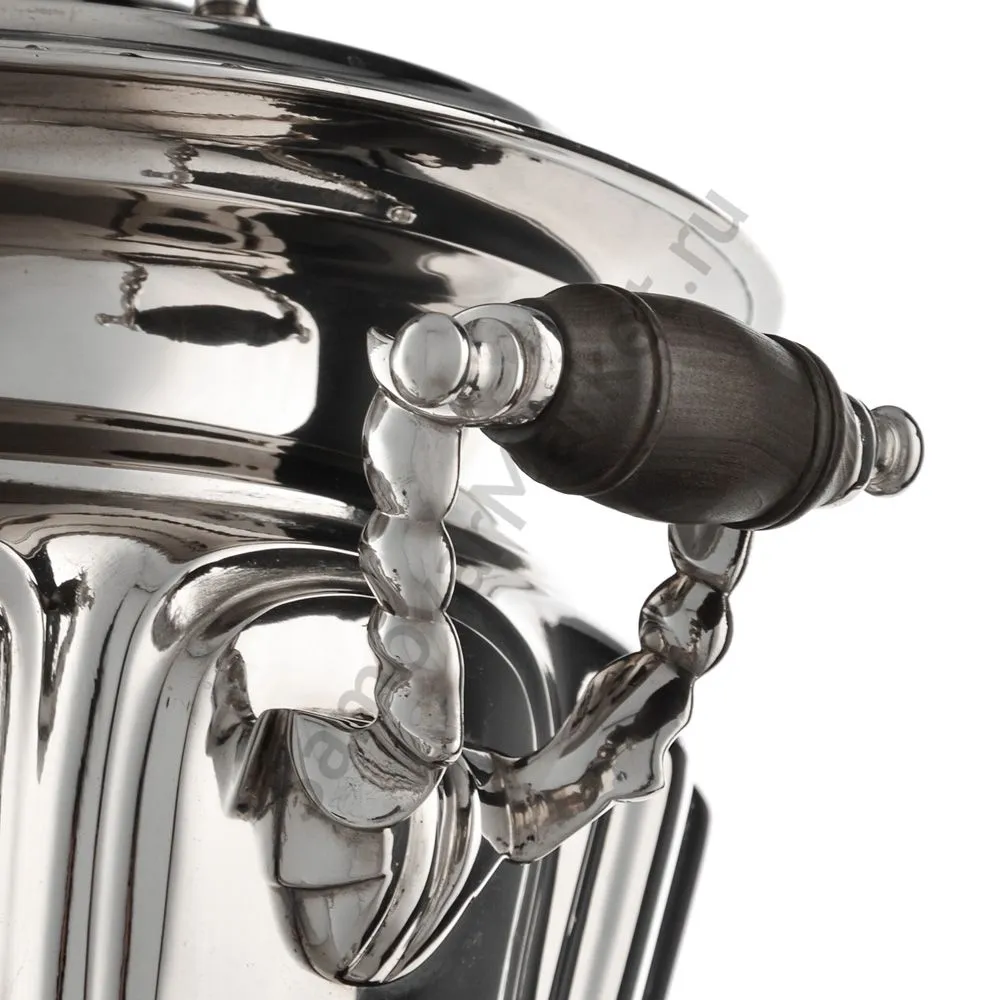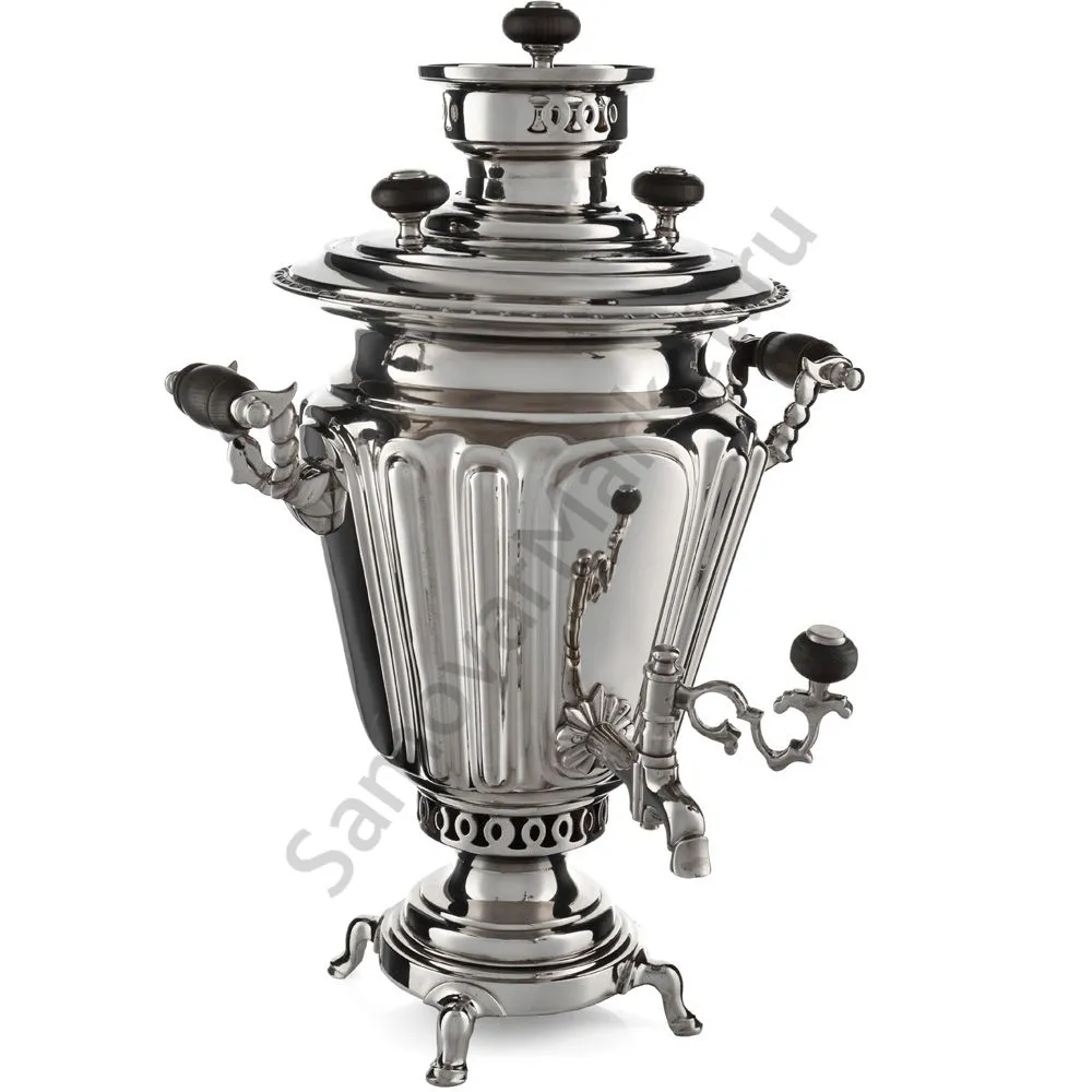 Этот самовар работает на дровах, углях, шишках, щепе. Топится он при помощи трубы, которая устанавливается сверху для усиления тяги. Или при помощи сапога в качестве мехов. Внутренние стенки покрыты пищевым оловом методом гальваники.