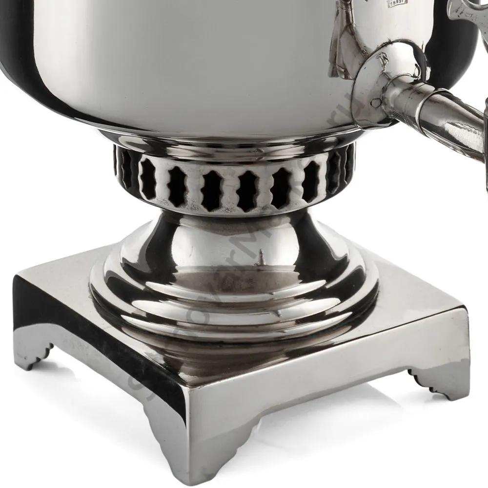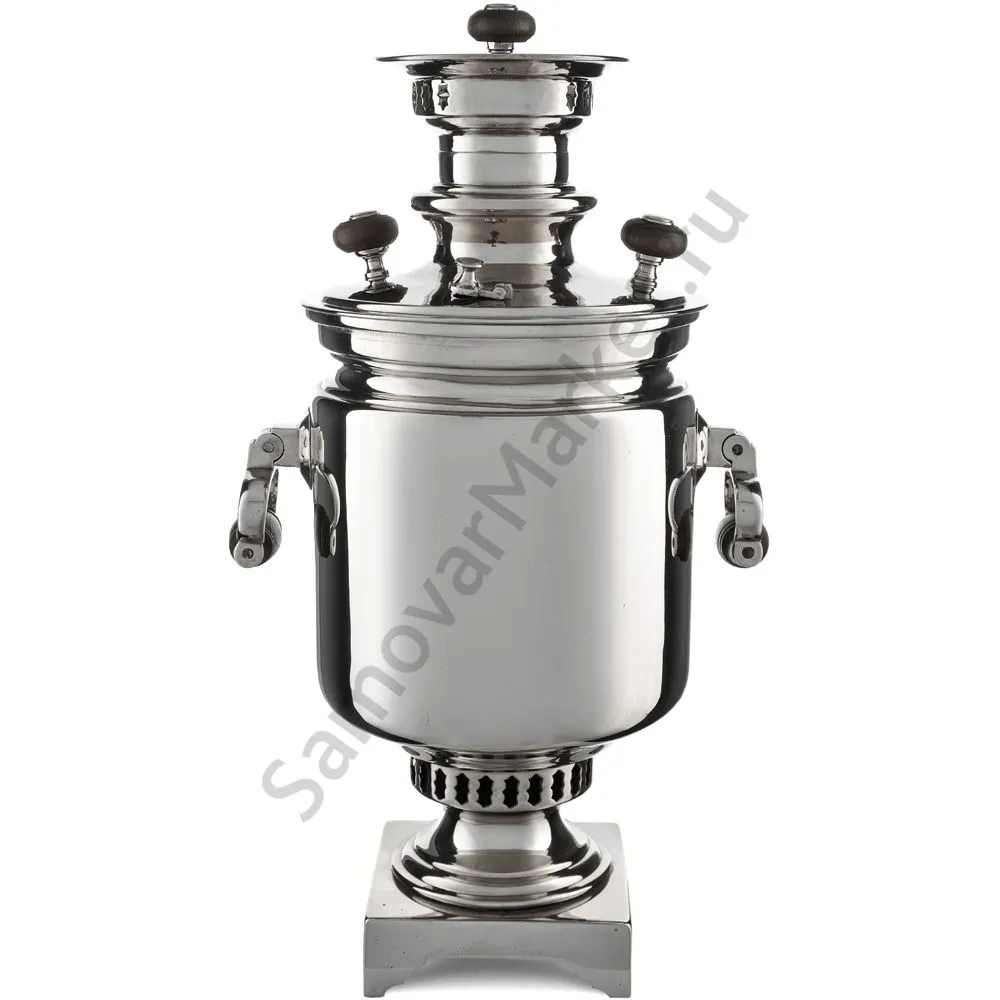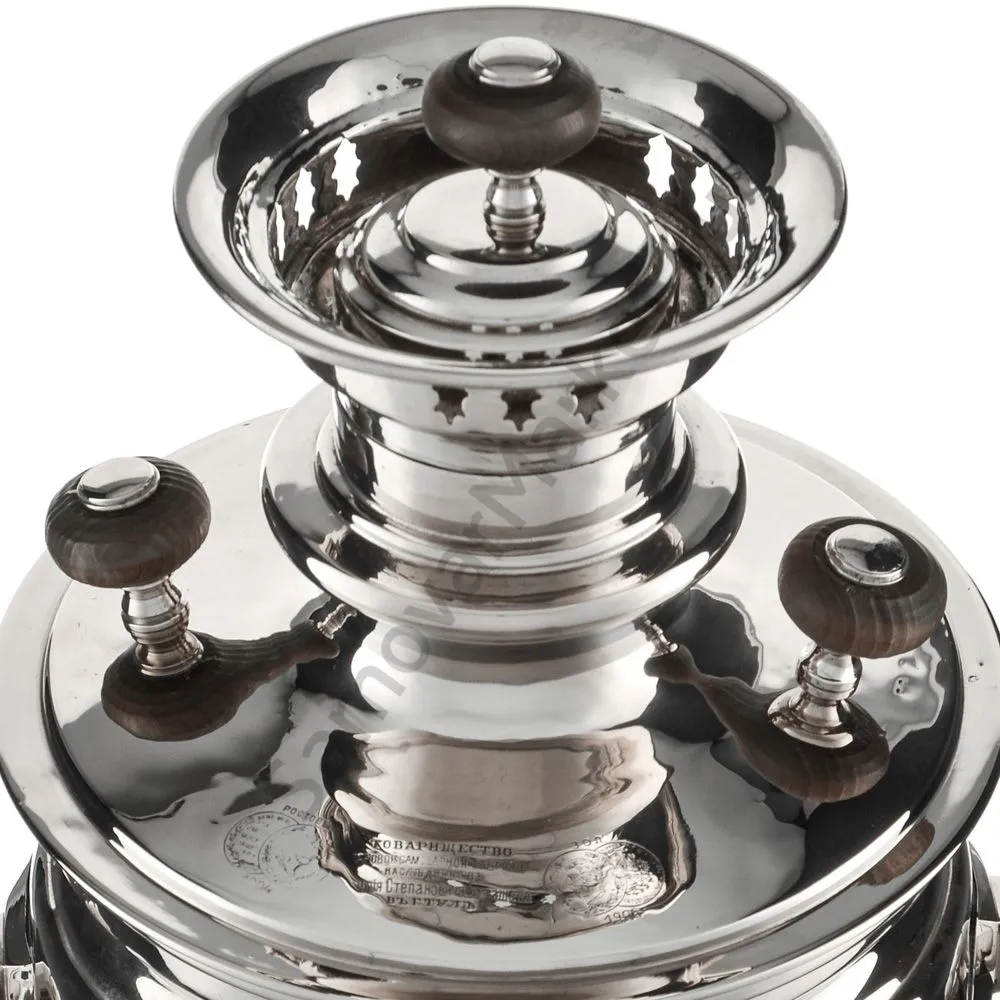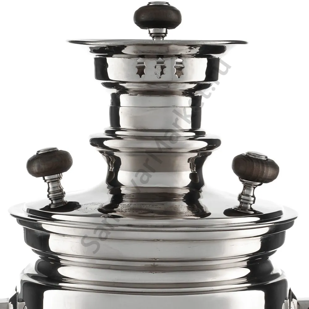 Этот самовар работает на дровах, углях, шишках, щепе. Топится он при помощи трубы, которая устанавливается сверху для образования тяги. Или при помощи сапога в качестве мехов. Внутренние стенки покрыты пищевым оловом методом гальваники.
