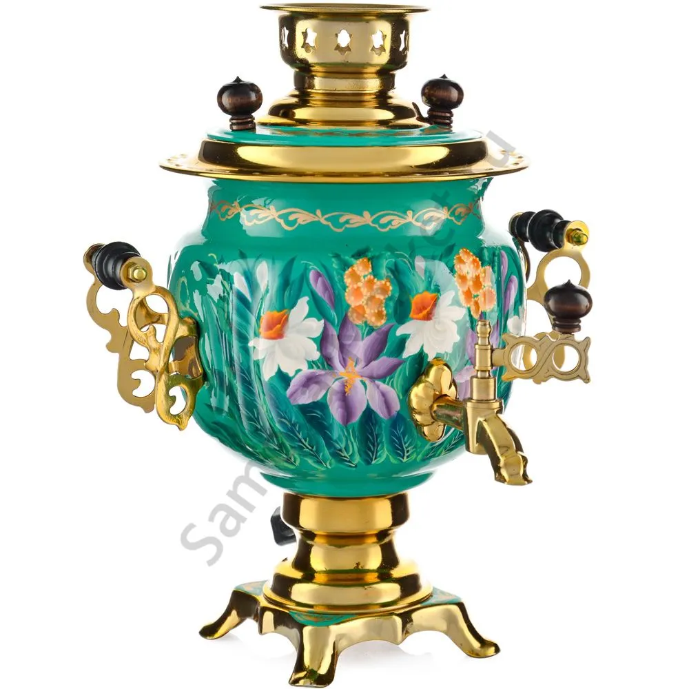 Ручки и хватки изготовлены из натурального дерева – берёзы, устойчивой к перепаду температур. Фурнитура роскошного глубокого каштанового цвета элитного красного дерева. Полностью готов к применению. Художественная роспись выполнена вручную специальными жаропрочными красками. Каждое изделие немного уникально и придает чаепитию особую красочность и даже праздничность. Сделано в Туле.