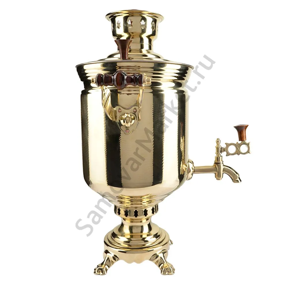 Этот самовар работает на дровах, углях, шишках, щепе. Топится он при помощи трубы, которая устанавливается сверху для образования тяги. Или при помощи сапога в качестве мехов. Внутренние стенки покрыты пищевым оловом методом гальваники.