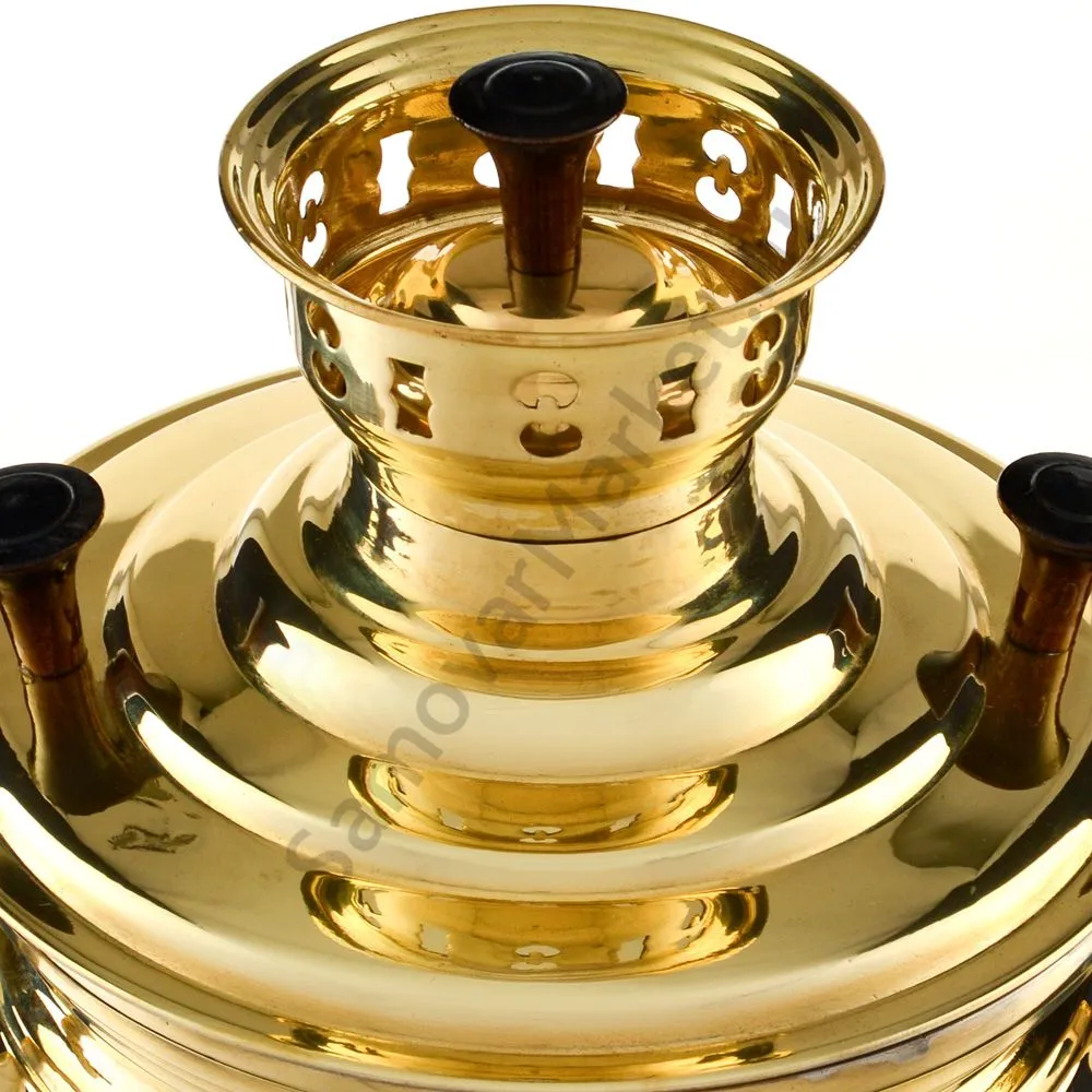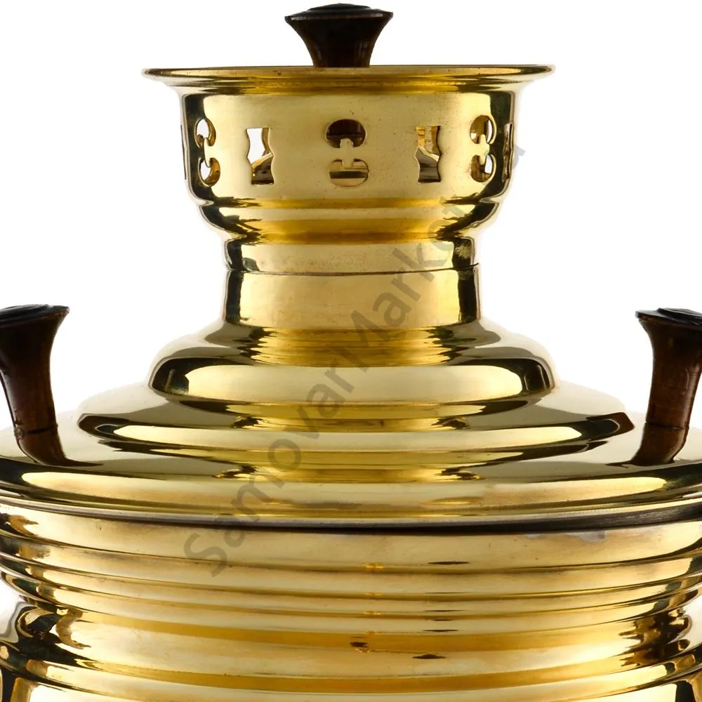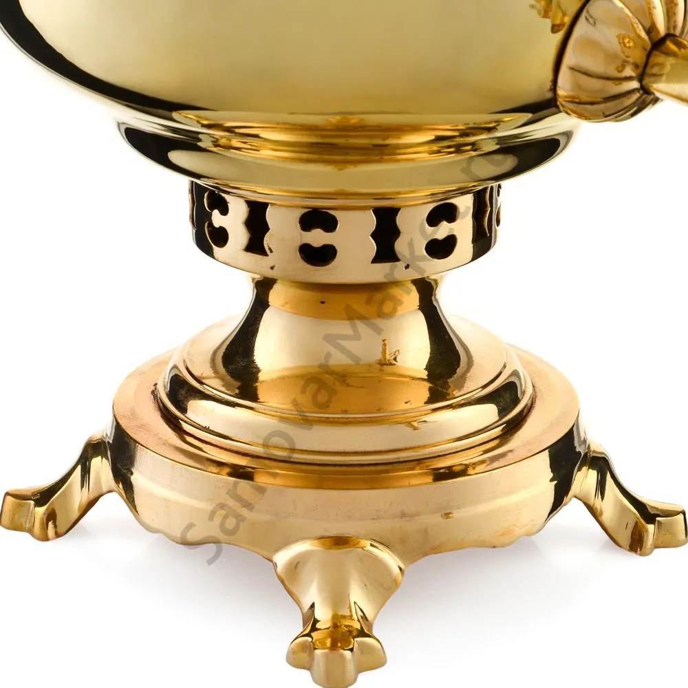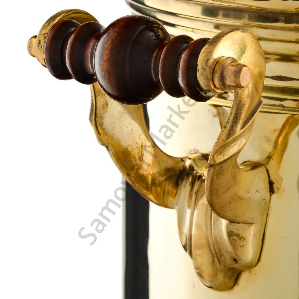 Этот самовар работает на дровах, углях, шишках, щепе. Топится он при помощи трубы, которая устанавливается сверху для образования тяги. Или при помощи сапога в качестве мехов. Внутренние стенки покрыты пищевым оловом методом гальваники.