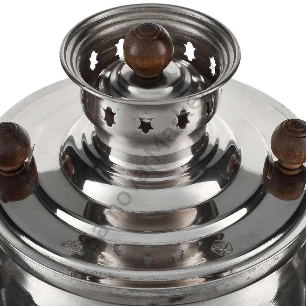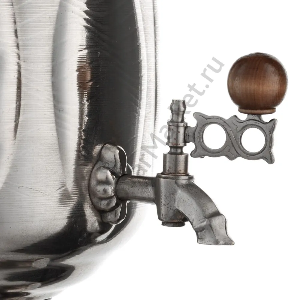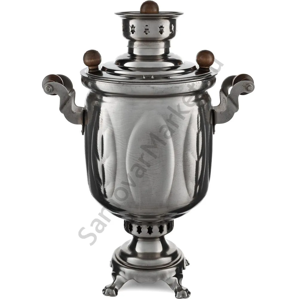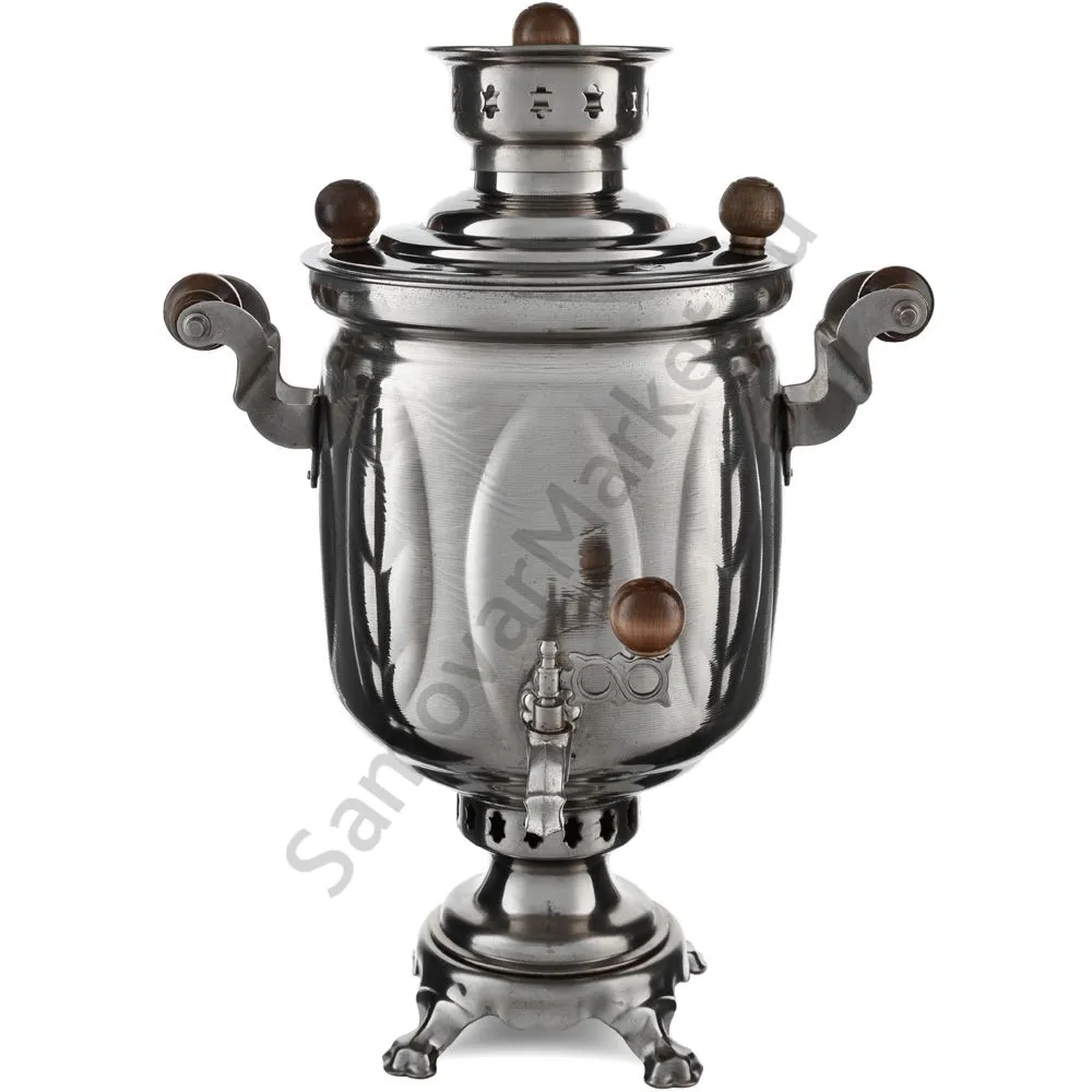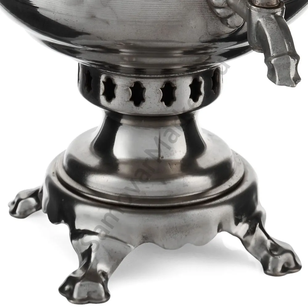 Этот самовар работает на дровах, углях, шишках, щепе. Топится он при помощи трубы, которая устанавливается сверху для образования тяги. Или при помощи сапога в качестве мехов. Внутренние стенки покрыты пищевым оловом методом гальваники.