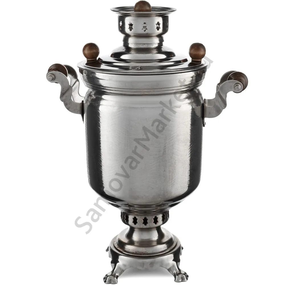 Этот самовар работает на дровах, углях, шишках, щепе. Топится он при помощи трубы, которая устанавливается сверху для образования тяги. Или при помощи сапога в качестве мехов. Внутренние стенки покрыты пищевым оловом методом гальваники.